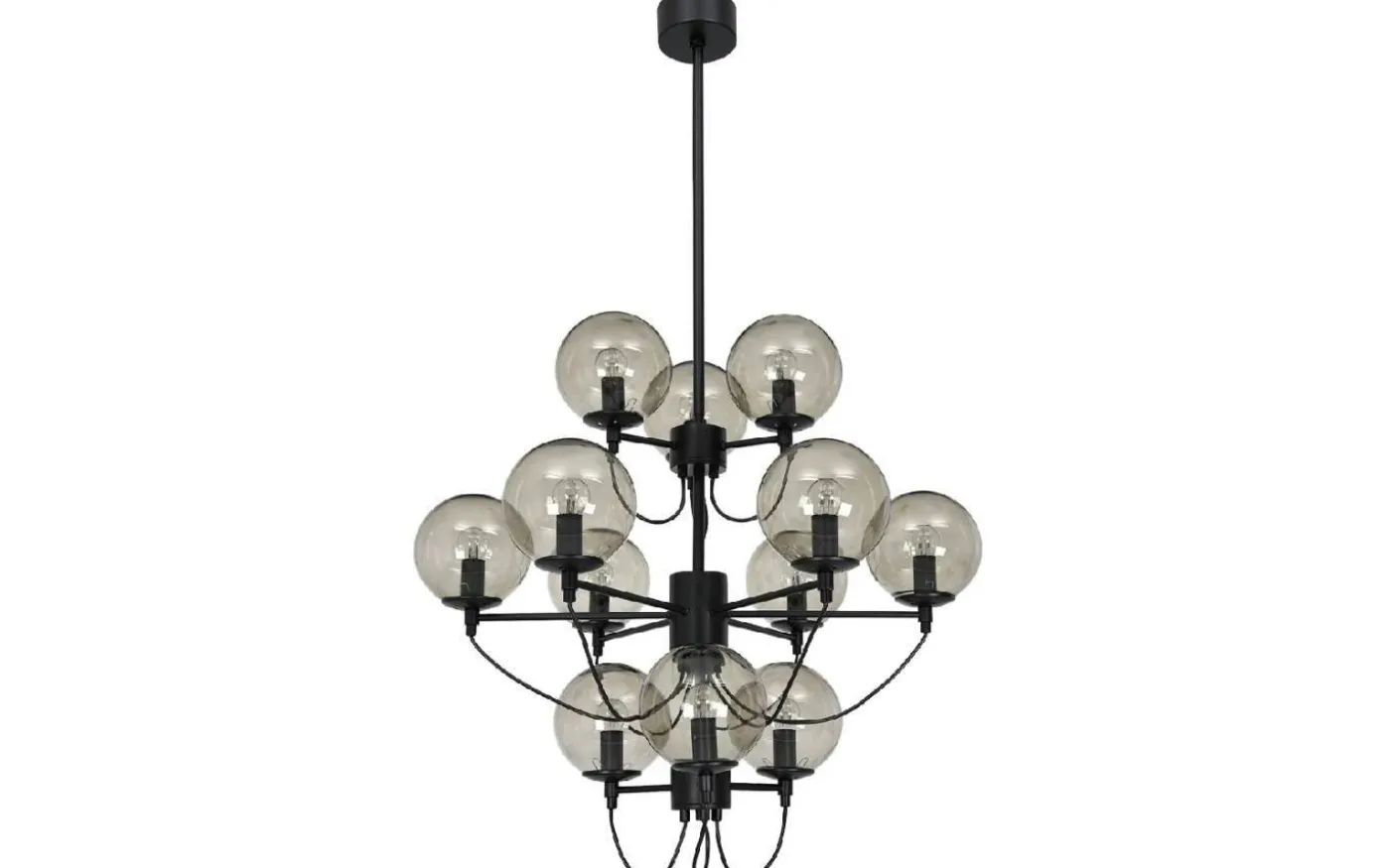 Lampan har stomme i svart metall kombinerat med 12 runda glaskupor i rökfärgat glas. De synliga, svarta kablarna ger lampan ett modernt och industriellt uttryck och blir en härlig kontrast till den stilrena designen. Varje glas har en diameter på 16 cm.