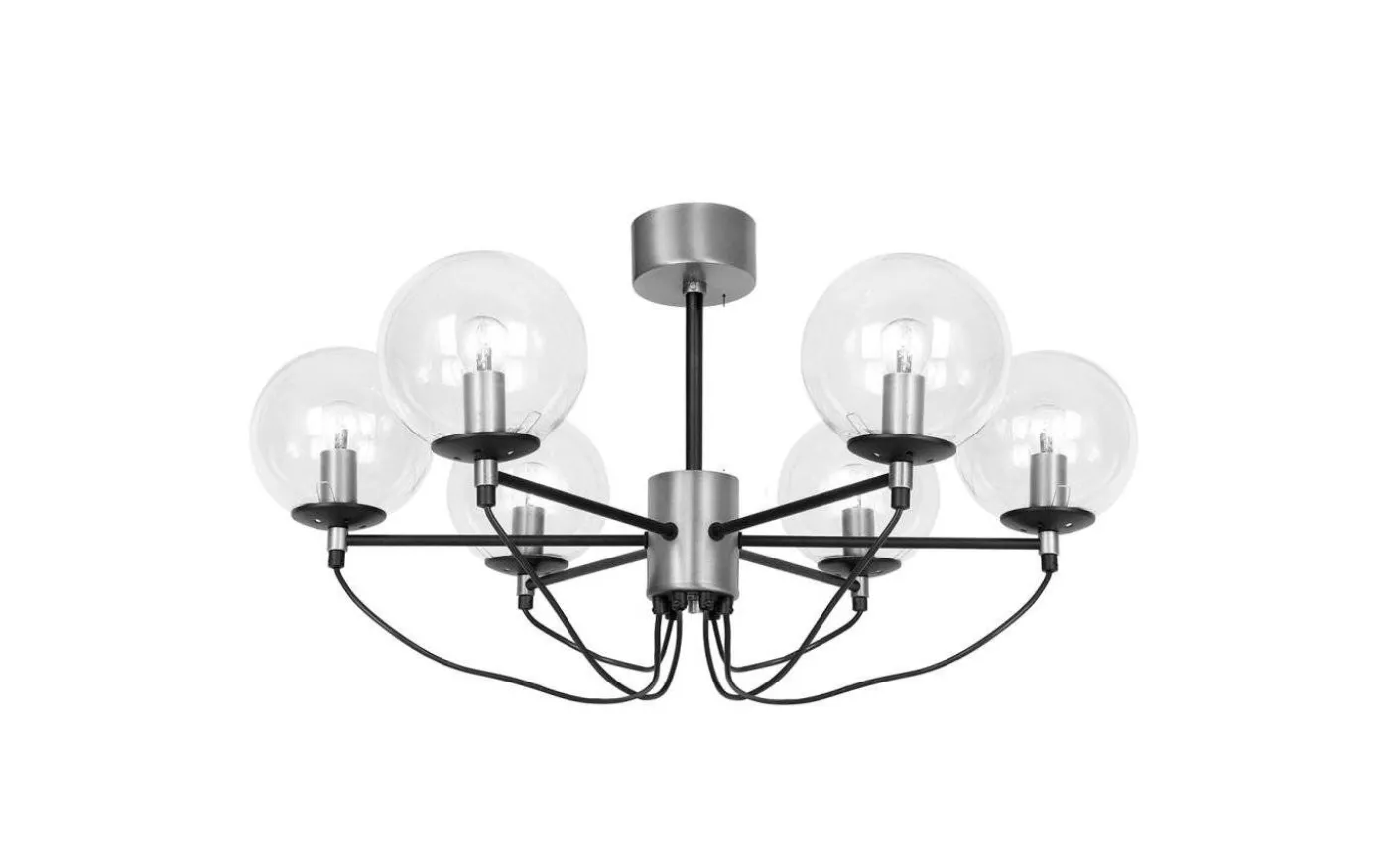 Lampan har stomme i svart metall med detaljer i borstad silver kombinerat med sex runda glaskupor i klarglas. De synliga, svarta kablarna ger lampan ett modernt och industriellt uttryck och blir en härlig kontrast till metallen.