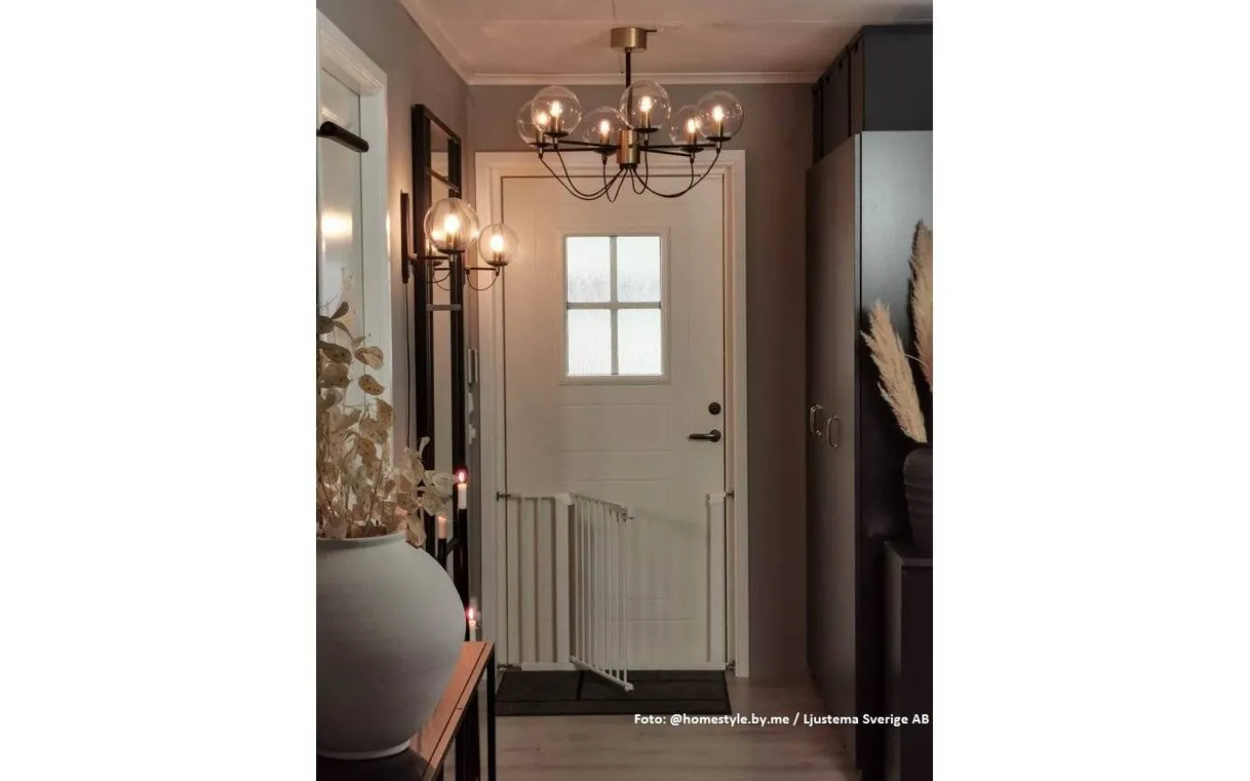 Lampan har stomme i svart metall med detaljer i borstad mässing kombinerat med sex runda glaskupor i klarglas. De synliga, svarta kablarna ger lampan ett modernt och industriellt uttryck och blir en härlig kontrast till den eleganta mässingen.