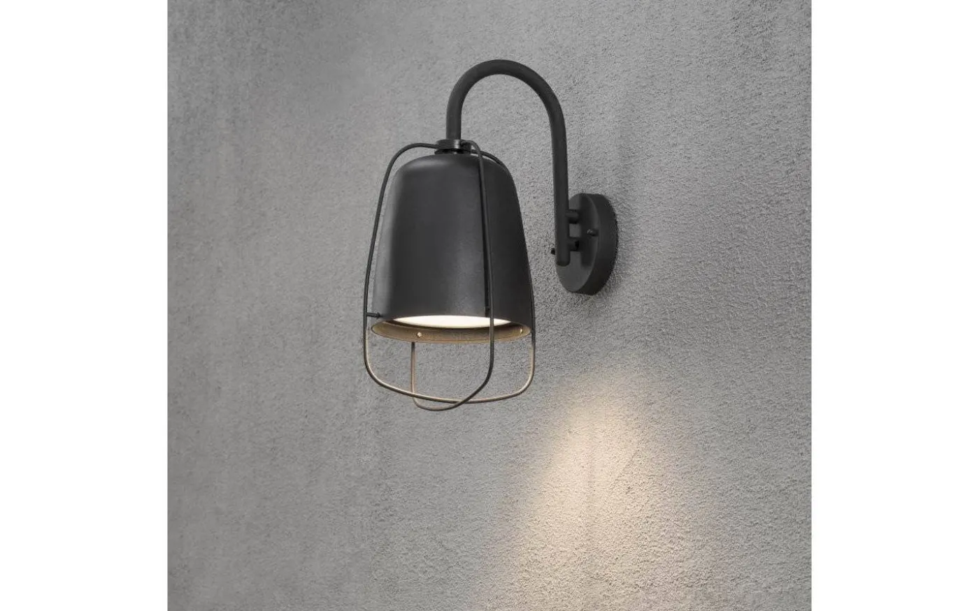 Denna högkvalitativa armatur med industriell touch är gjord av aluminium och snyggt lackerad i svart. Vägglyktan avger en vacker och behaglig ljusspridning nedåt. Installeras smidigt med 230V.