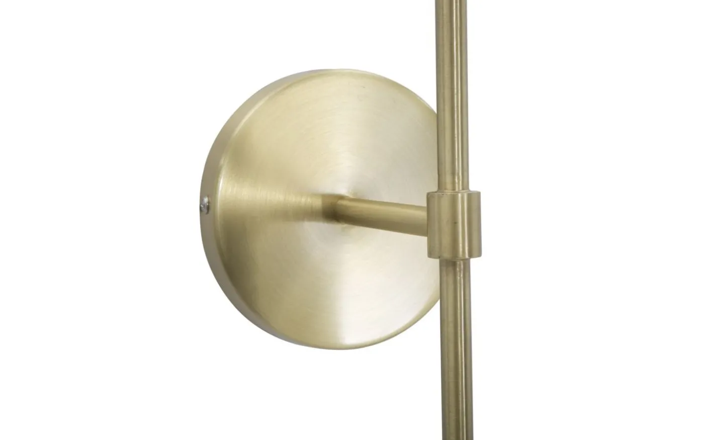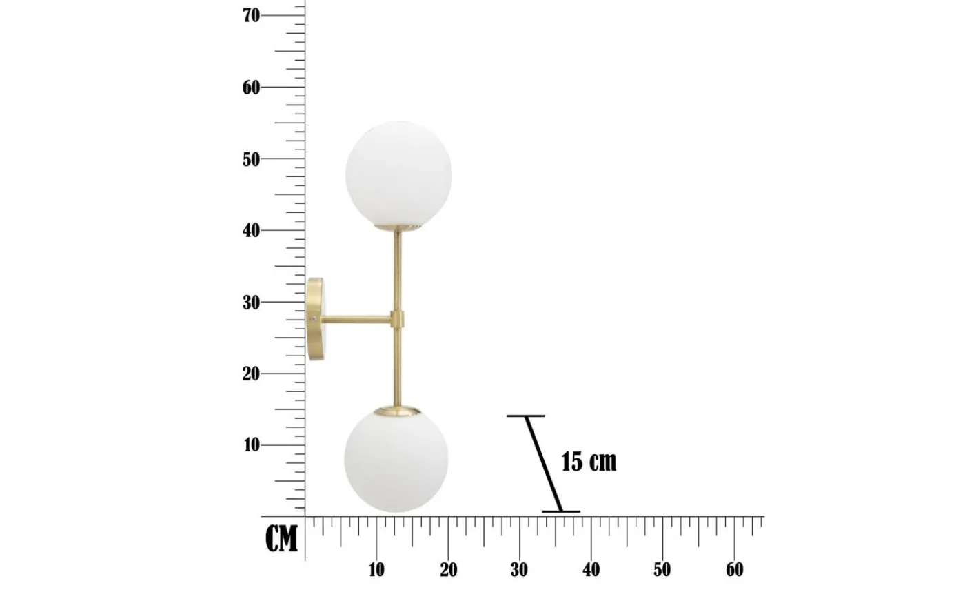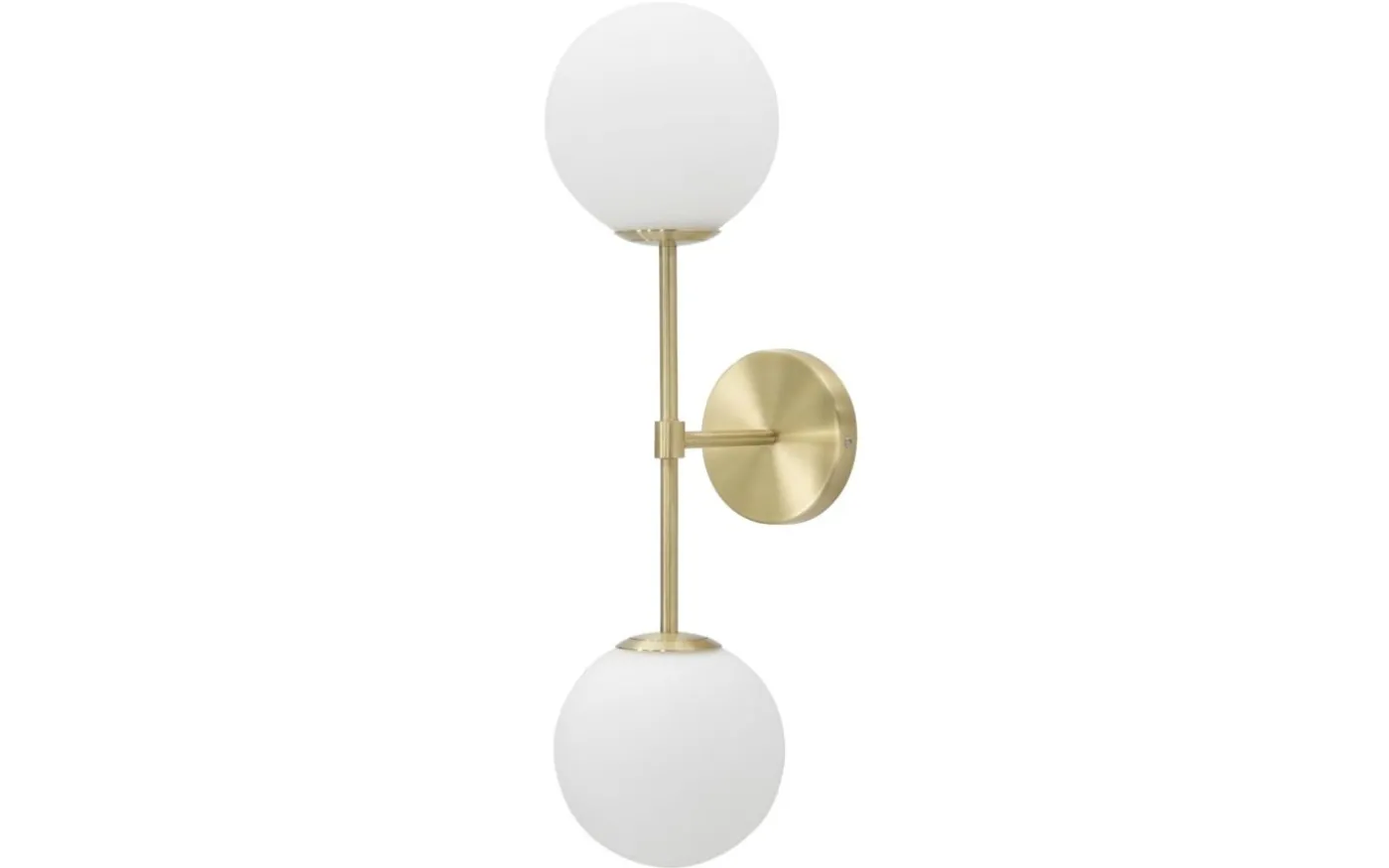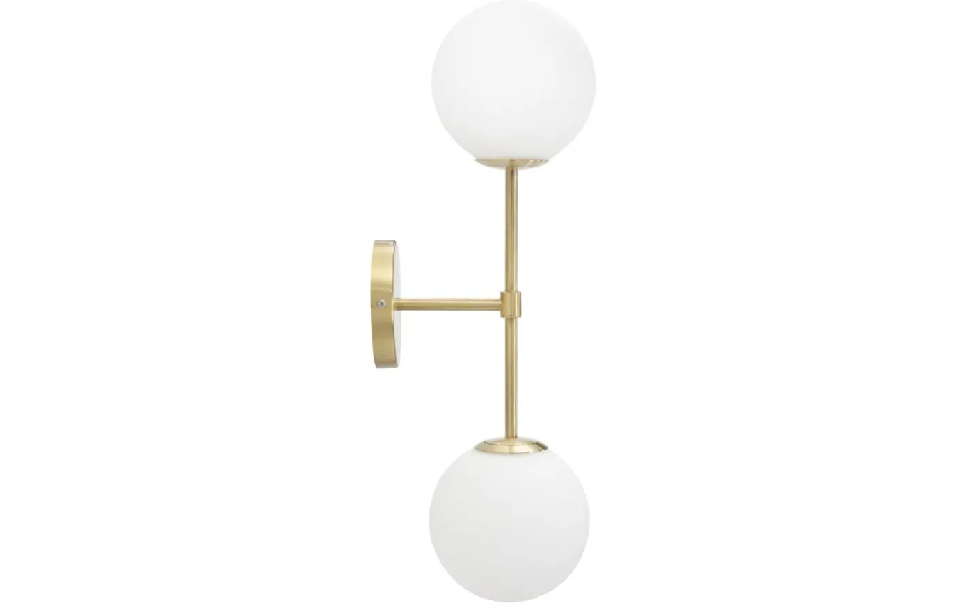Gyllene metall 2 lampor vägglampa med vita glaskulor. De väsentliga linjerna kombineras med guldets elegans för att skapa en unik design.