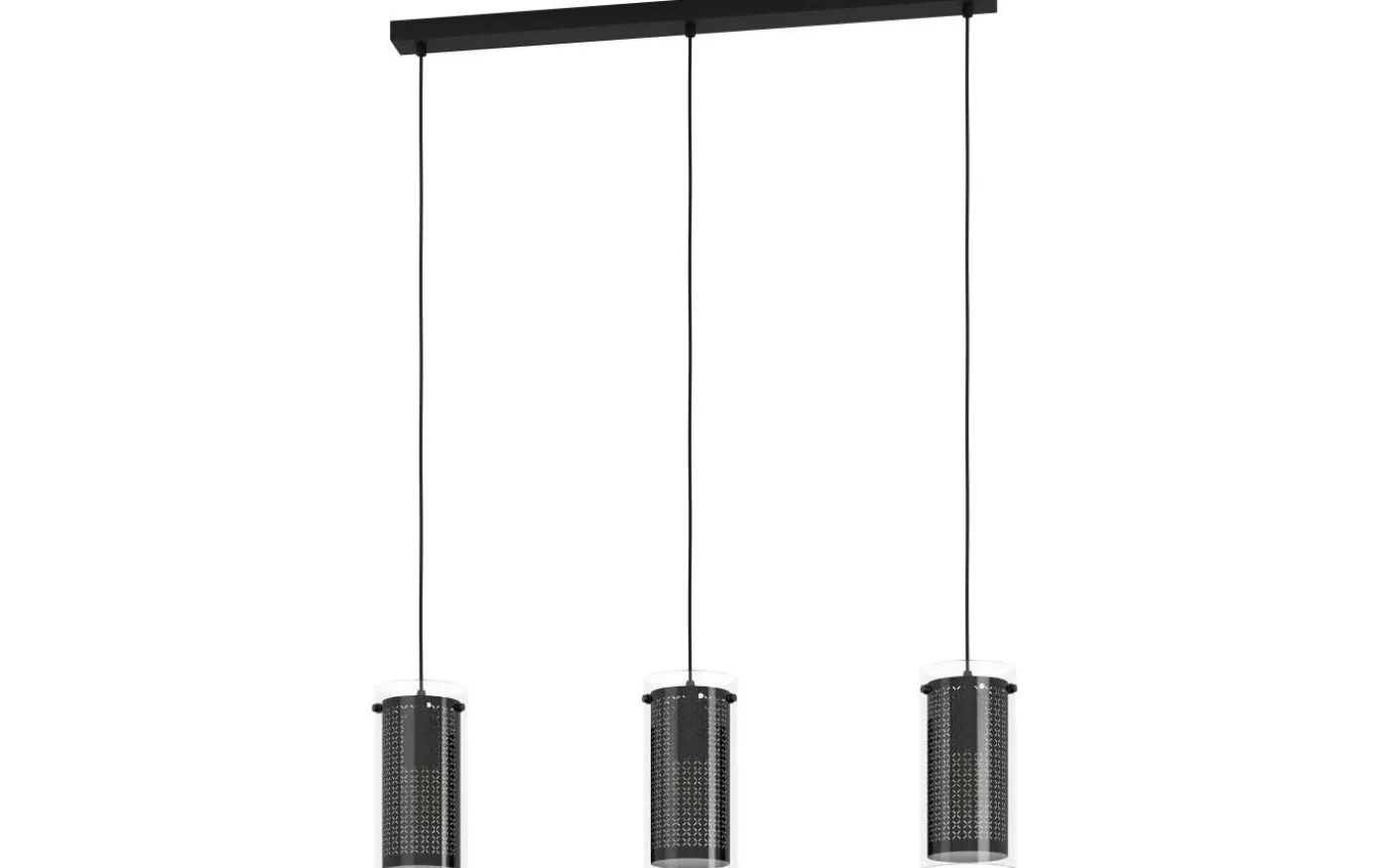 Pendlingslampan PINTO TEXTIL 1 har tre cylindriska lampskärmar av glas upphängda i svarta textilkablar från ett metalltak. Varje armatur har en inre svart tyglampskärm med utskurna detaljer och skapar ett fascinerande spel av ljus och skugga när ljuset är på. Pendellampan har en enkel design som fungerar bra i nästan alla inredningsstilar och ger en attraktiv belysning till vardagsrummet eller över ett långbord i matsalen.