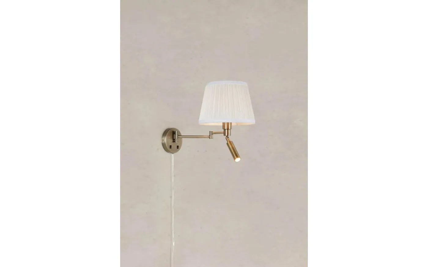 Pivot vägglampa från Markslöjd. Vägglampa i antik mässing med två armar- en swingarm med en offwhite textilskärm och en justerbar LED-läslampa för riktat ljus. Textilskärmen har en diameter på 25cm och bidrar med ett behagligt sken. Bygelupphäng. Integrerad kopplingsbox i väggplattan möjliggör enkel anslutning till fast elinstallation. Klass II. 1xE27+LED, Max 40W,4W. E27 ljuskälla ingår ej.