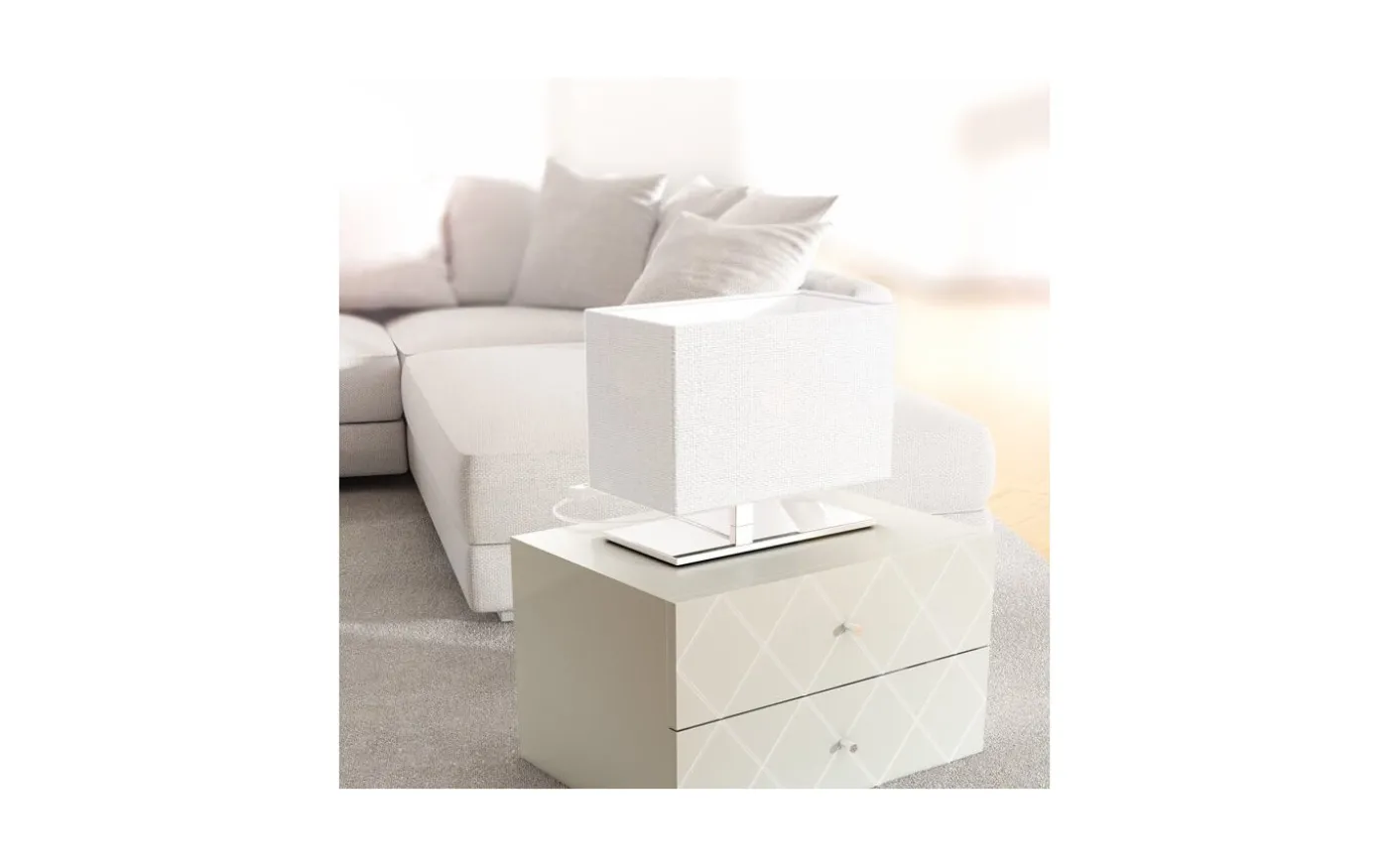 Bordslampan har en bas i krom och en vit texturerad textilskärm.