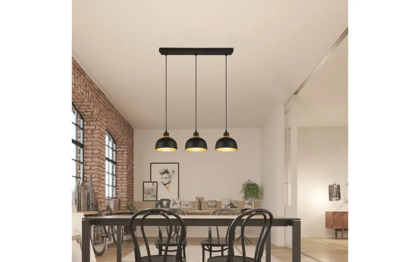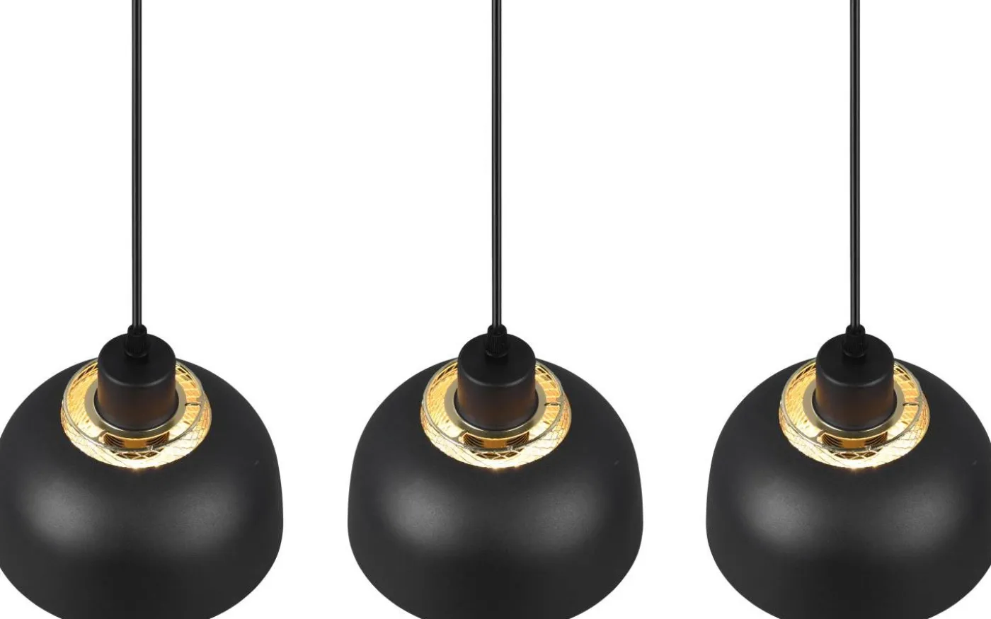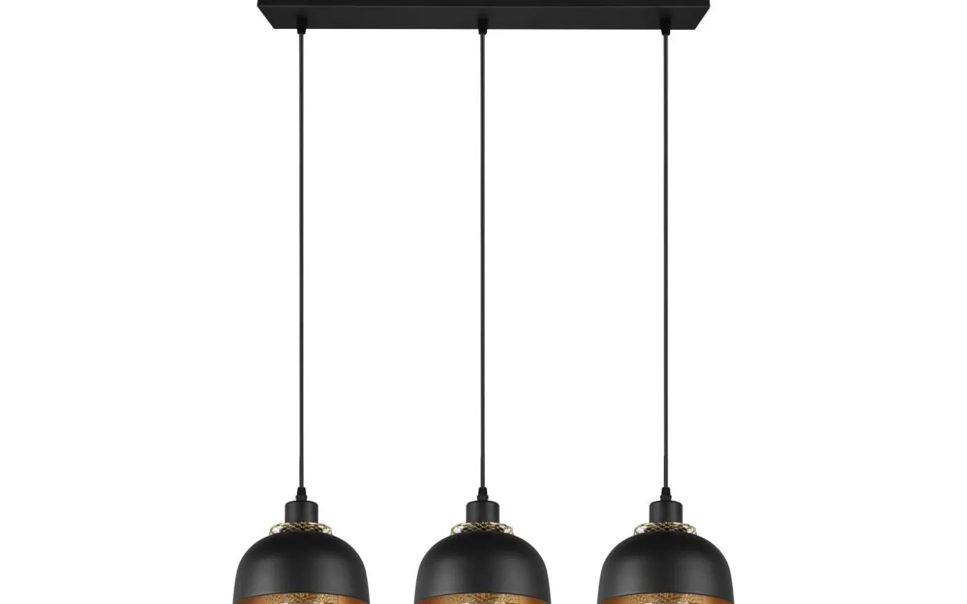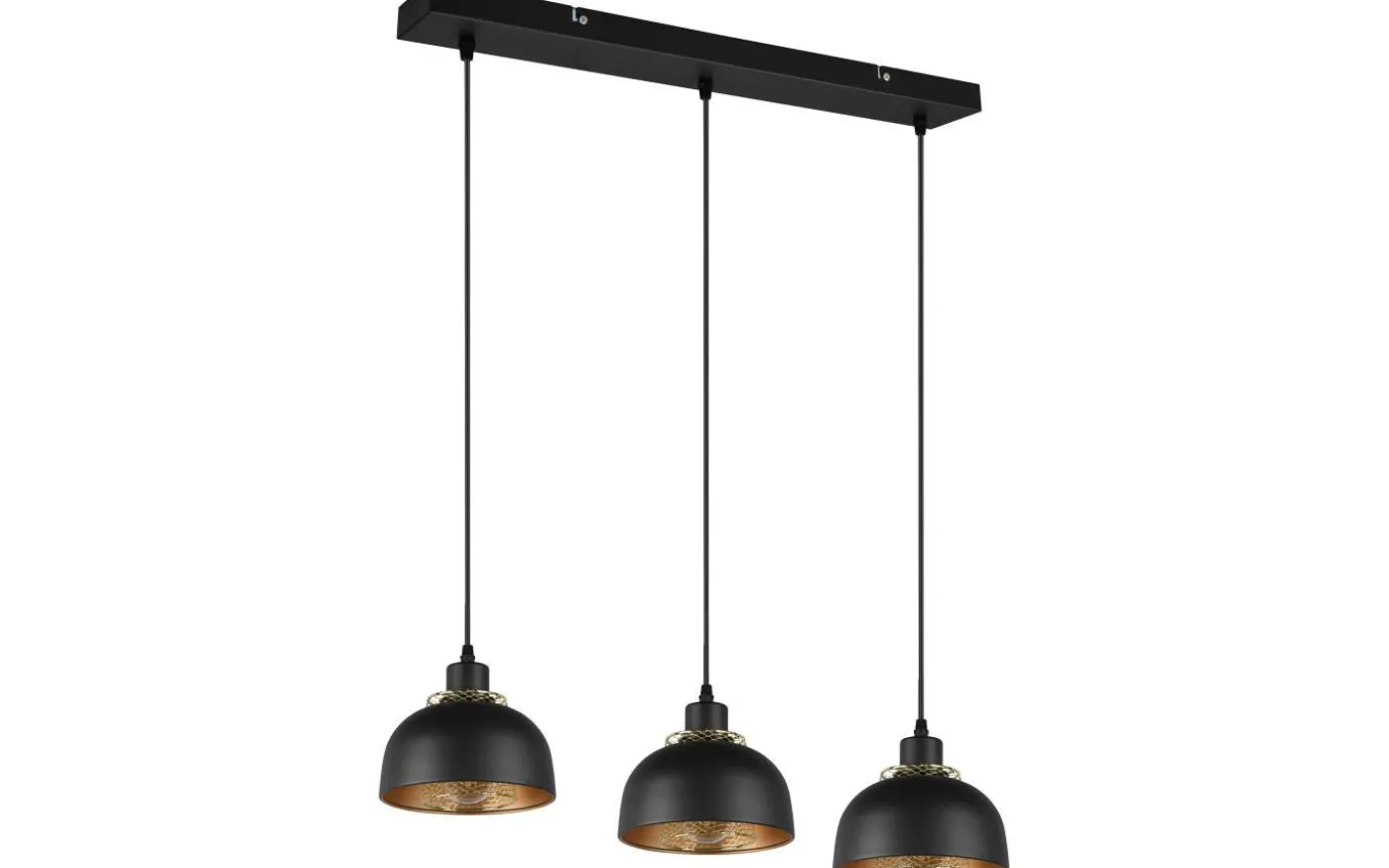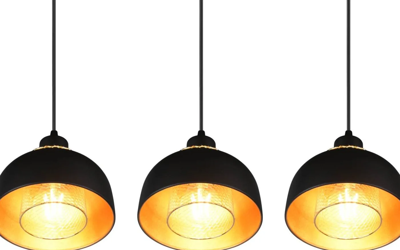 Pendelarmaturen med tre ljuskällor i PUNCH-serien övertygar med sitt industriella utseende och passar perfekt in i moderna, puristiska inredningsstilar i köket eller matsalen. De stora skärmarna, som var och en kompletteras invändigt av en andra mindre skärm i gitterlook som designelement, kommer till sin rätt på ett fantastiskt sätt och ger speciella ljuseffekter. Armaturens eleganta form och färgdesign i mattsvart och guld ger dina egna fyra väggar en industriell atmosfär. För modern och pålitlig belysning rekommenderas en LED-lampa. Den erbjuder hög ljuskvalitet, är mångsidig och övertygar med jämn belysning. Dess långa livslängd och låga värmeutveckling gör den till det perfekta valet för en mängd olika användningsområden. Ljuskälla: exklusiv 3x E27 · max. 40W. Extra information: Justerbar i höjd, Takmontering, IP20, Lampa(or) ingår ej