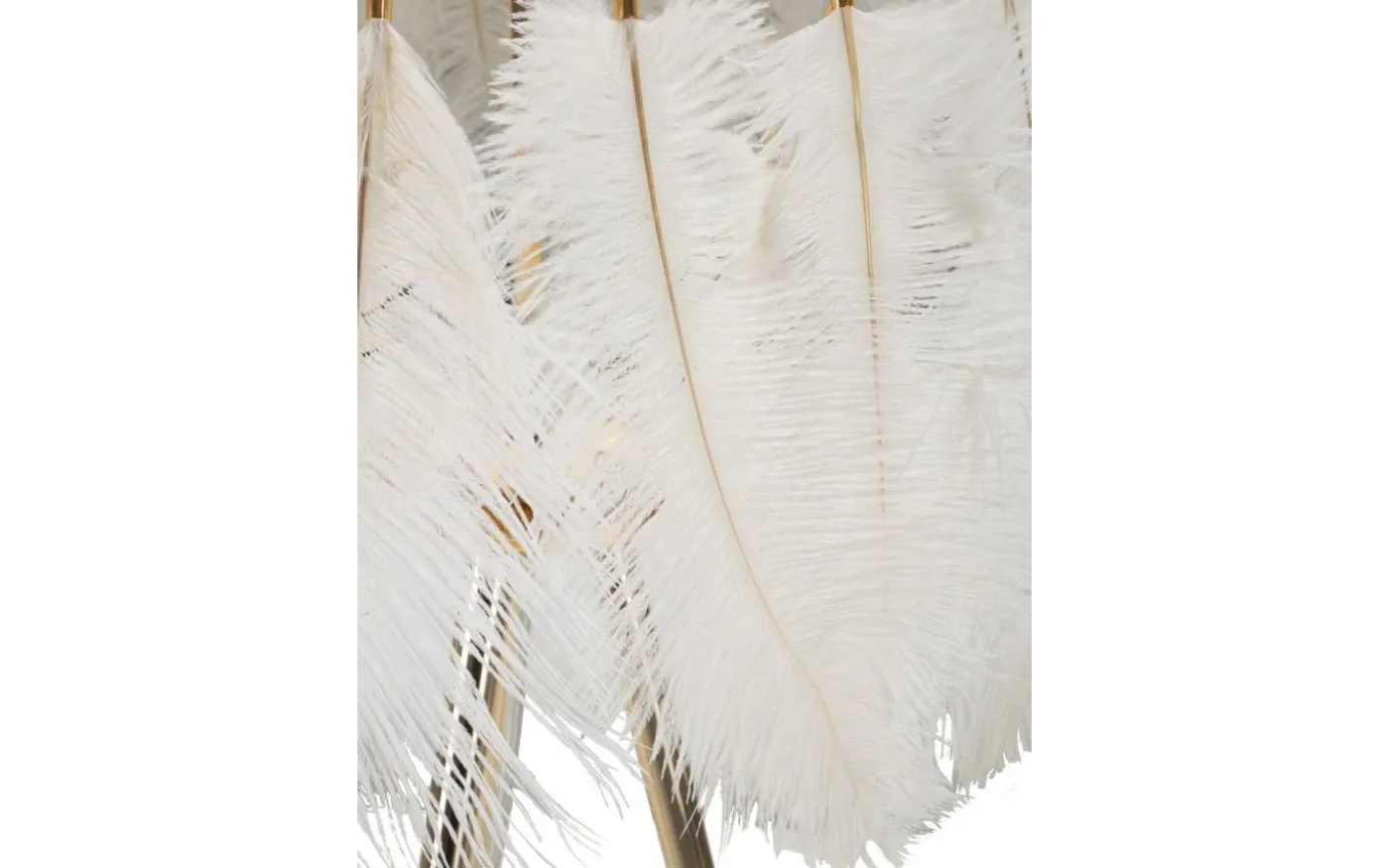 Golvlampa i gyllene metall bildad av tre stavar och lampskärm sammansatt av vita fjädrar.
