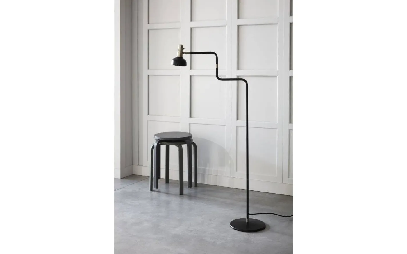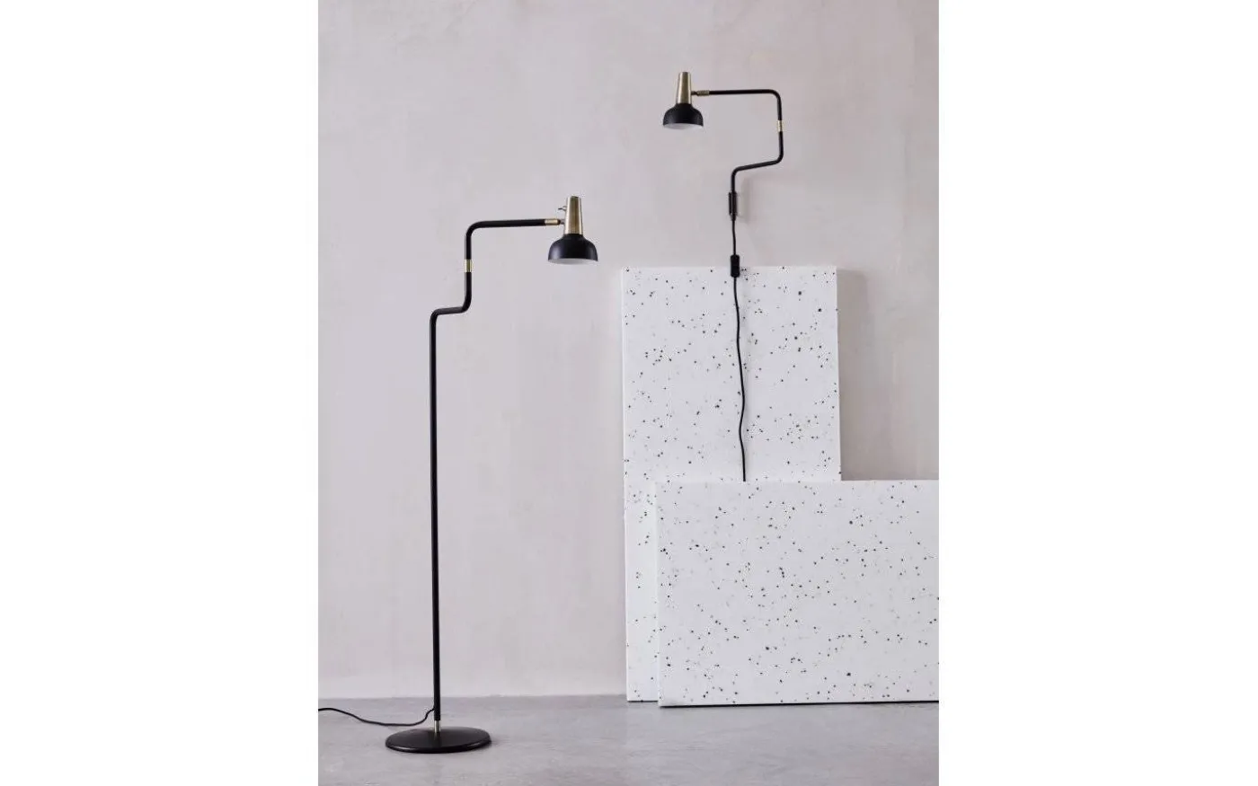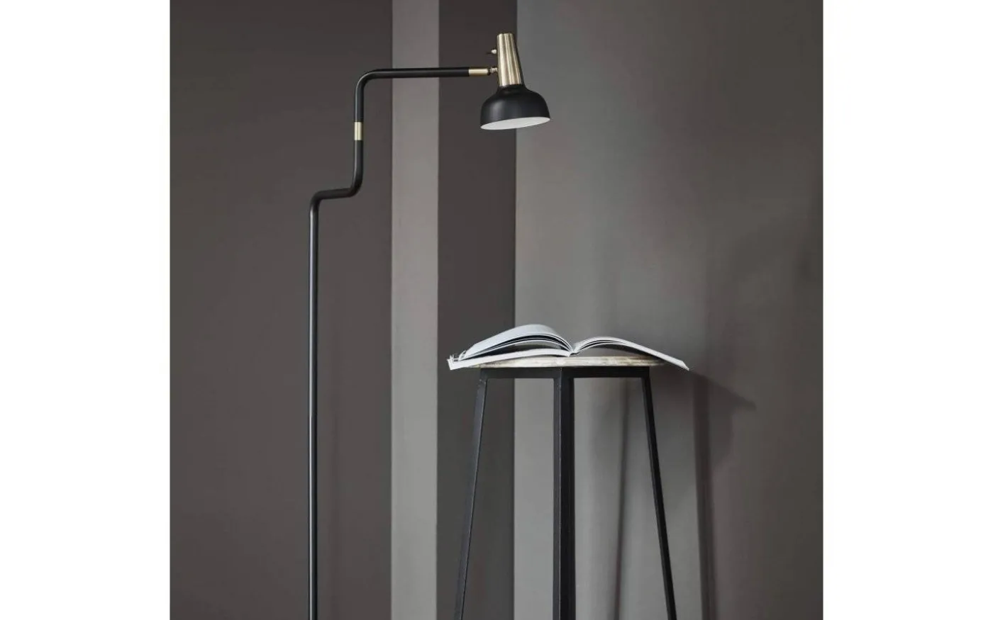 Lampans arm är justerbar i sidled och lamphuvudet är riktbart så du enkelt kan justera riktningen på ljuset efter eget önskemål. Stommen är gjord av svartlackerad metall med detaljer i mässing med en oxiderad (mörkare) slipad finish. Placera Ray golvlampa vid soffan eller favoritfåtöljen och få en läslampa i toppklass!
