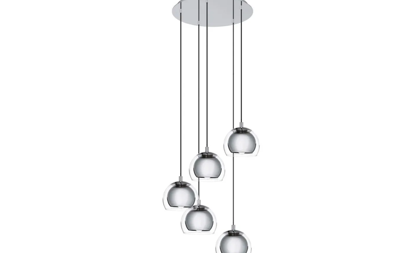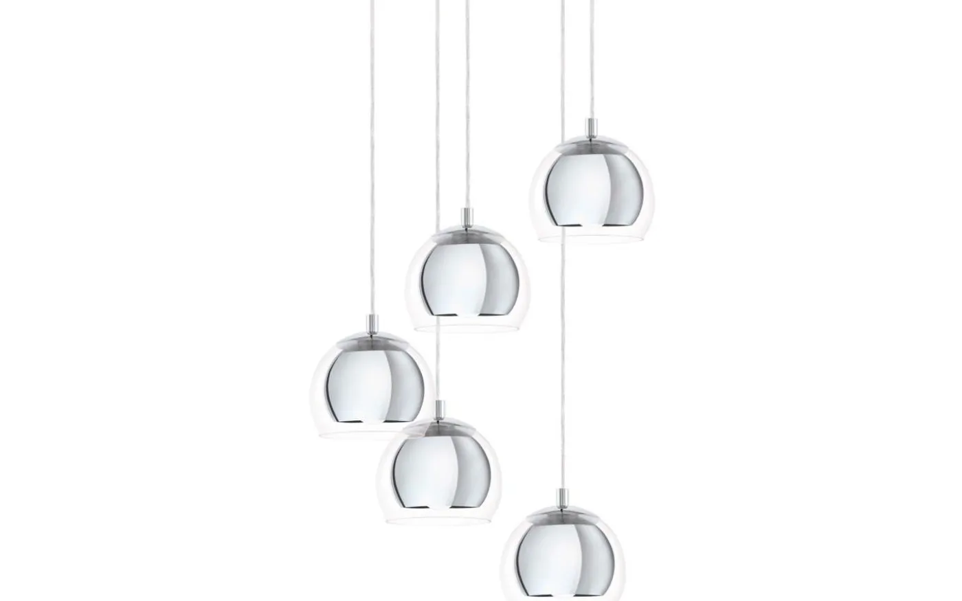 ROCAMAR taklampa har fem sfäriska skärmar av klarglas, som var och en omger med en inre lampskärm i krom. Designen har en rund kromfärgad metallkapell. Denna eleganta taklampa erbjuder en slående finish till moderna interiörer och ger stilfull belysning i vardagsrummet eller ovanför bordet i matsalen.