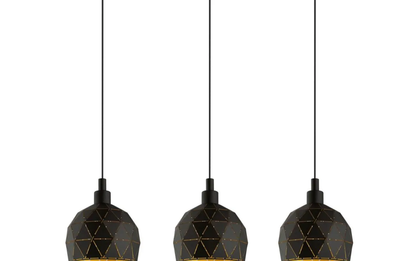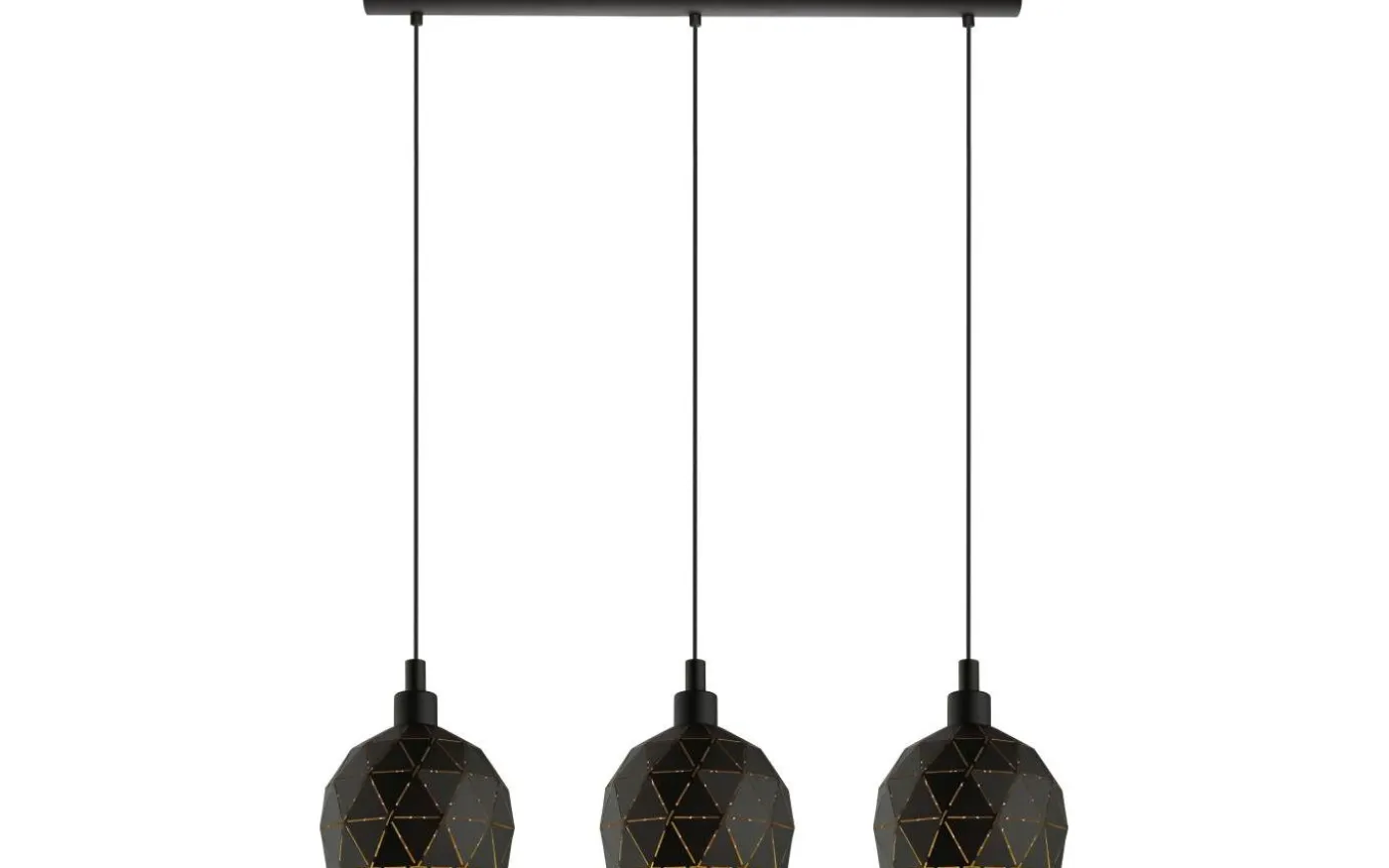 ROCCAFORTE taklampa har tre runda svarta metalllampskärmar, var och en med en geometrisk design och en inre guldfinish. De triangulära utskärningarna skapar ett fascinerande spel av ljus och skugga när ljuset är på. Denna taklampa kompletterar moderna och skandinaviska inredningsstilar och skapar iögonfallande belysning i alla utrymmen, oavsett om det är i vardagsrummet eller över ett långbord i matsalen.