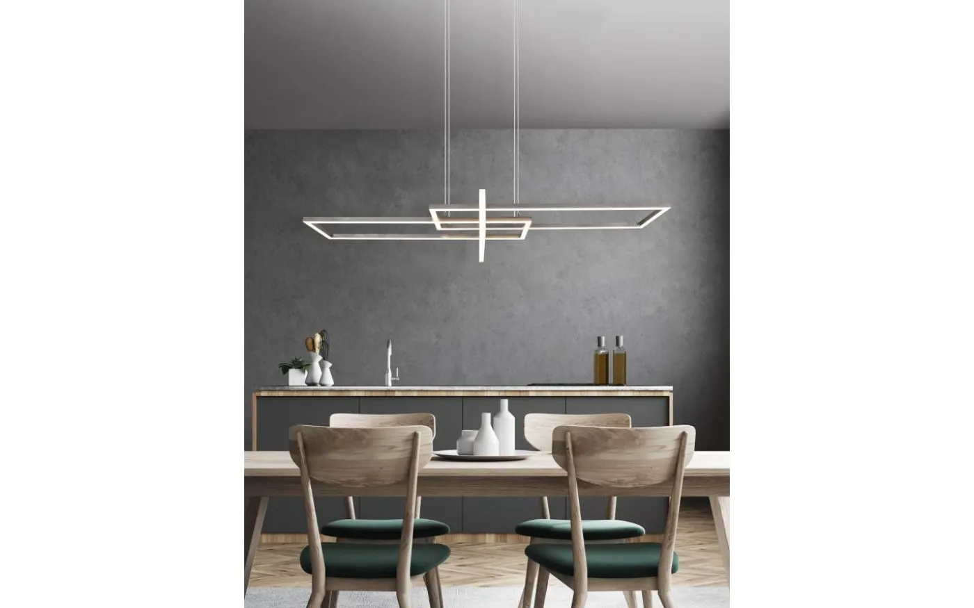 Pendellampan SALINAS berikar din inredning med en elegant och imponerande design. Placerad ovanför matbordet betonar lampan den moderna livsstilen och ger en behaglig belysning med tre olika ljuselement. Armaturen har också en SWITCH-dimmer, vilket gör att ljusstyrkan kan justeras från 100 %, till 50 % och till 25 % med en vanlig ljusströmbrytare. Den tidlösa färgdesignen i matt nickel förvandlar lampan till ett elegant element i bostaden som är en absolut höjdpunkt även när den är släckt. Dessutom använder armaturerna modern LED-teknik, vilket står för hög ljuskvalitet. LED-ljuskällor kännetecknas av lång livslängd och låg värmeutveckling. Ljuskälla: inklusive 1x SMD LED, 34W · 1x 4200lm, 3000K. Extra information: Justerbar i höjd, IP20, Ej dimbar, Dimbar via strömbrytare