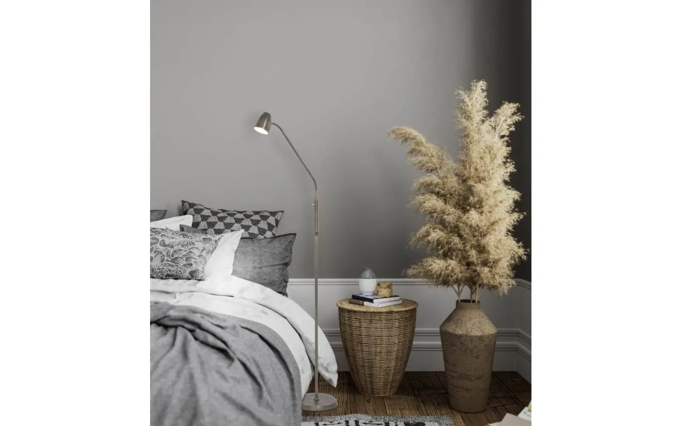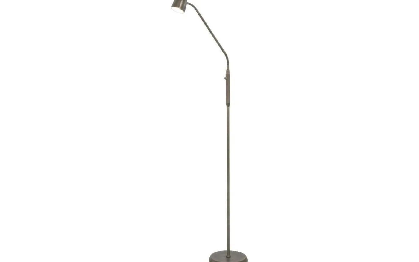 Sandnes golvlampa i tennfärgad metall. Lampan är väl lämpad som läslampa eftersom den har en dimmer på stången samt ett justerbart huvud. Max 8W, ingår ej. Ansluts med sladd och stickpropp.