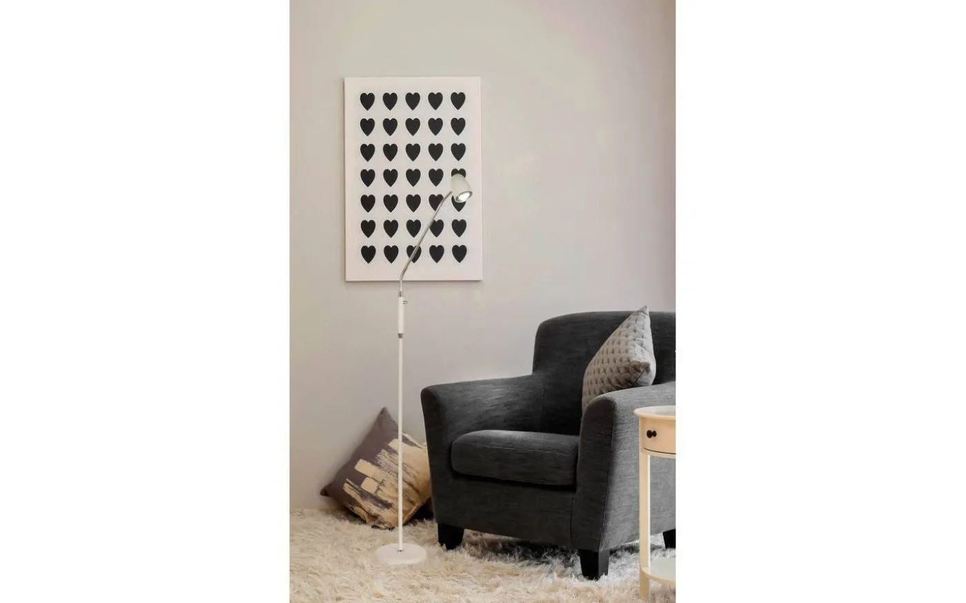 Sandnes golvlampa i vitlackerad metall. Lampan är väl lämpad som läslampa eftersom den har en dimmer på stången samt ett justerbart huvud. Max 8W, ingår ej. Ansluts med sladd och stickpropp.