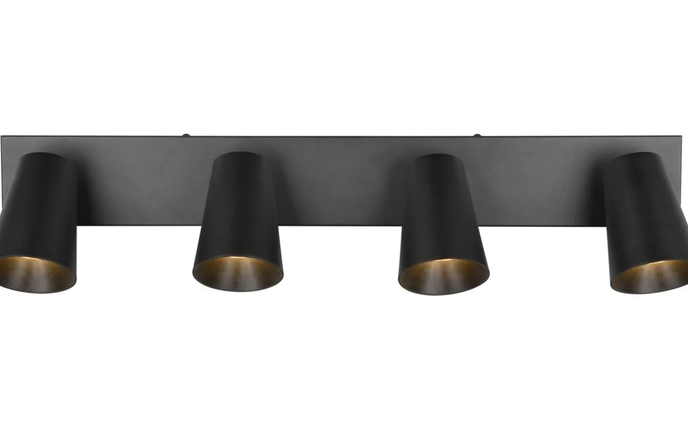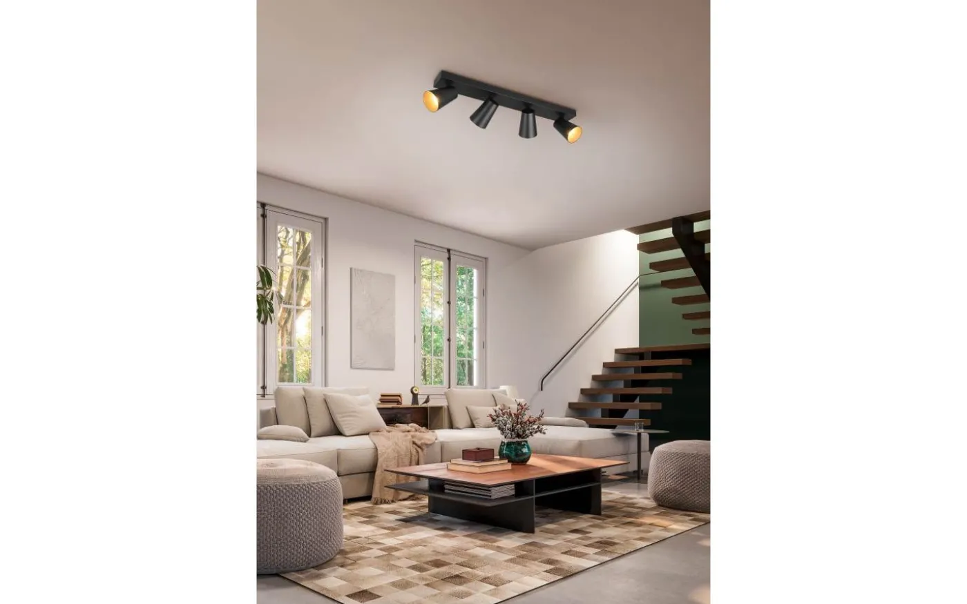 Lamporna i SHARP-serien kännetecknas av sin moderna design och mångsidighet. Tack vare de vridbara spotlighterna är tak- och vägglampan med fyra ljuskällor idealisk som en kompletterande ljuskälla i köket eller i små rum och ger ditt hem en mysig atmosfär. Armaturens eleganta mattsvarta färg ger rummet en sofistikerad touch. De utbytbara skydden i svart och guld erbjuder också ett flexibelt samspel med ljuset. För modern och pålitlig belysning rekommenderas användning av en LED-lampa. Den erbjuder hög ljuskvalitet, är mångsidig och övertygar med jämn belysning. Dess långa livslängd och låga värmeutveckling gör den till det perfekta valet för en mängd olika tillämpningar. Ljuskälla: exklusiv 4x GU10 · max. 10W. Extra information: Takmontering, IP20, Lampa(or) ingår ej