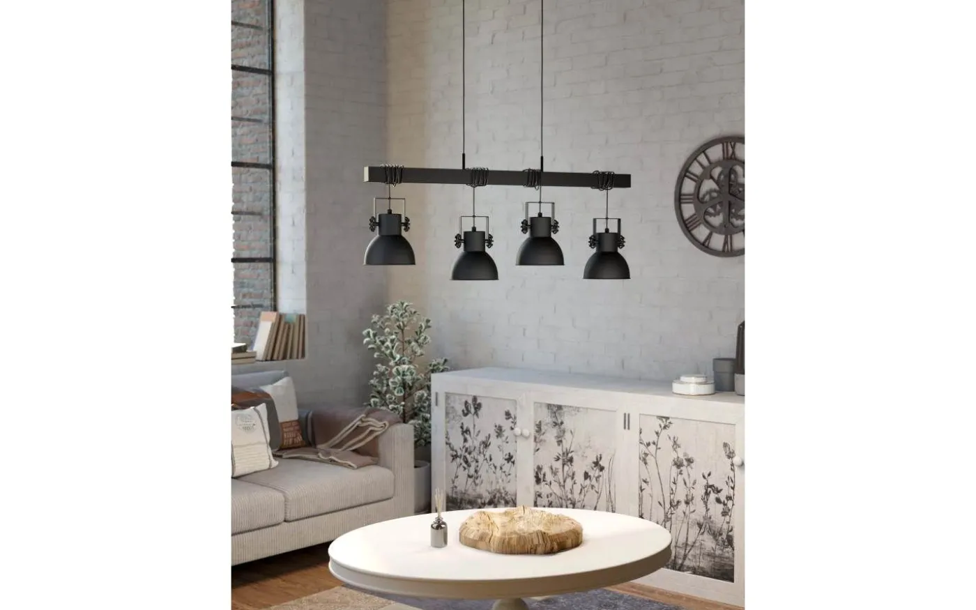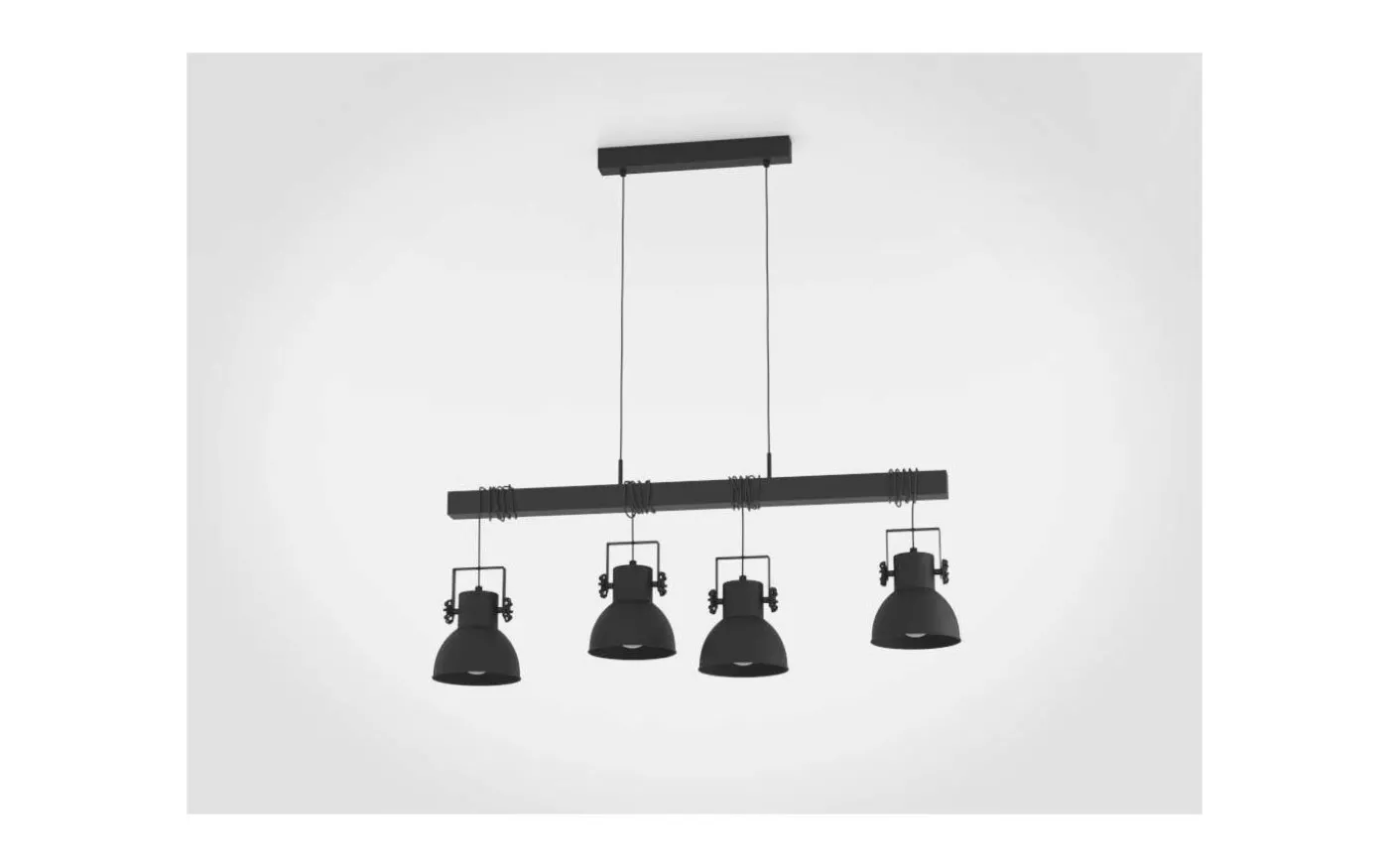 SHIREBROOK taklampa har en svart träbalk och fyra svarta metallskärmar. De svarta fästskruvarna på lampskärmarnas sidor förstärker den rustika designen. Lampskärmarna kan hänga på olika höjder helt enkelt genom att linda eller varva upp repen. Med sin övertygande kombination av furu och metall smälter taklampan sömlöst in i interiörer i industriell stil och skapar en distinkt, iögonfallande funktion i vardagsrummet eller över ett långbord i matsalen.