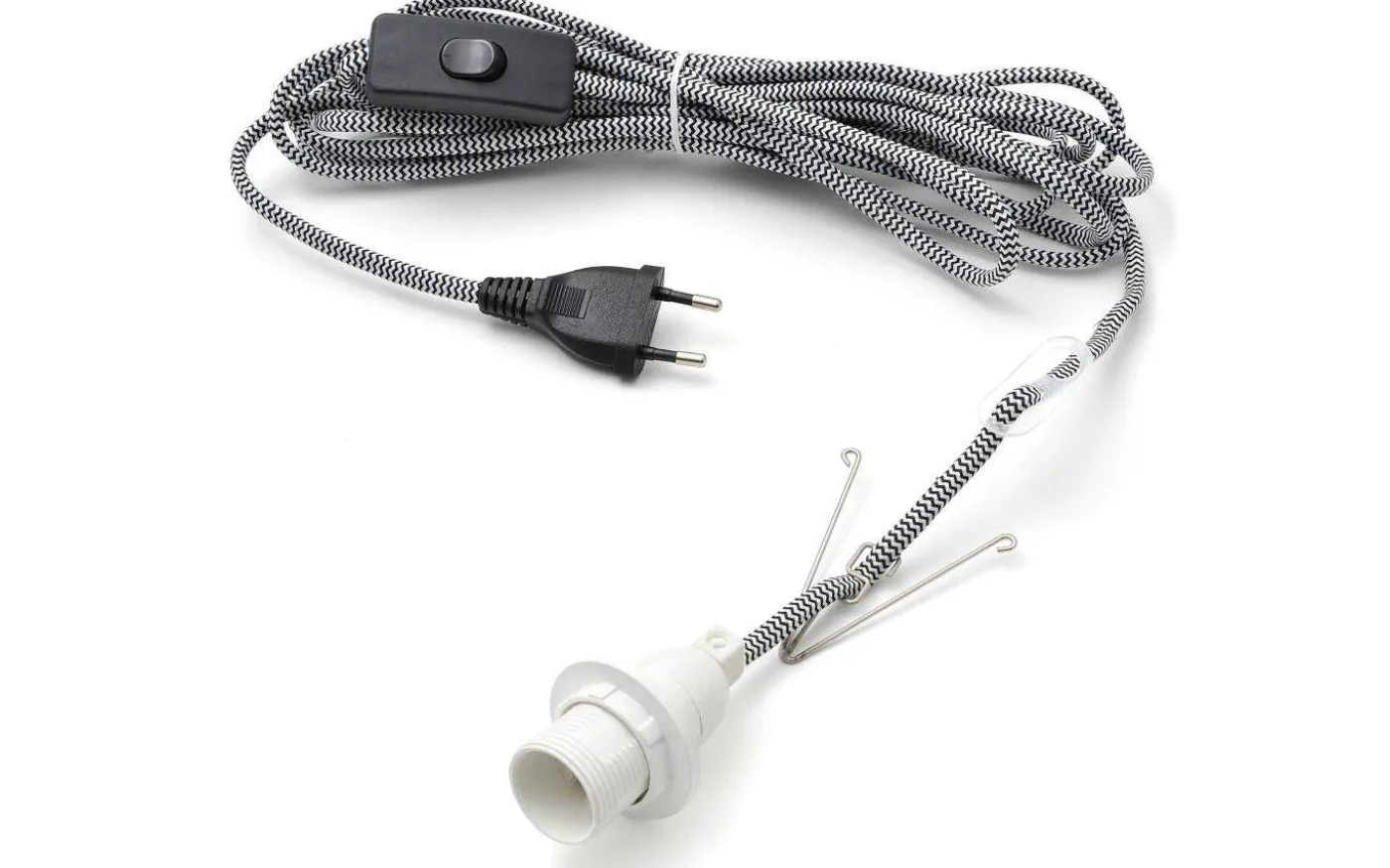 Sicksackmönstrat sladdställ med textilkabel från Konstsmide. Sladdstället är 5m lång och har en E14 lamphållare. Sladdstället har strömbrytare och stickkontakt för vägguttag.
