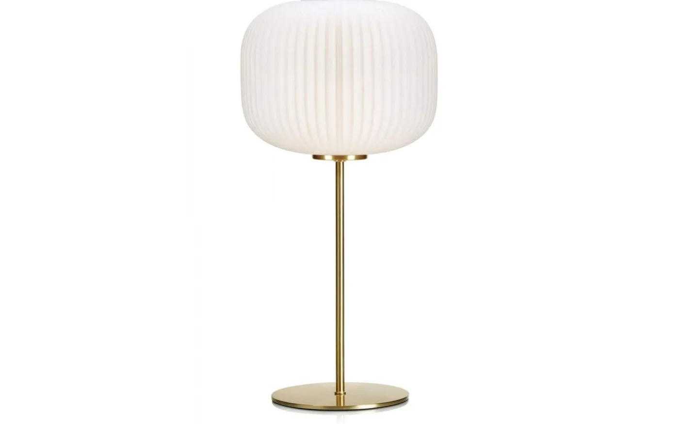 Fina bordslampan Sober är en läcker bordslampa, från välkända Markslöjd, med fot i borstad mässing kombinerat med vit glasskärm.