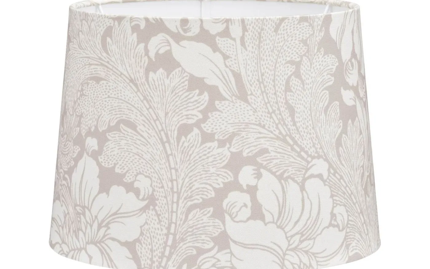 Lampskärm med mönstret Acanthus i en lugn och elegant beige ton från Boråstapeter. Det härliga mönstret med blommor och stilfulla blad passar i många typer av rum.Skärmens mått: 25 cm diameter i botten, 22 cm i toppen och 18 cm hög. E27 fäste. Gjord i 100% återvunnen polyester, tryckt i Borås.
