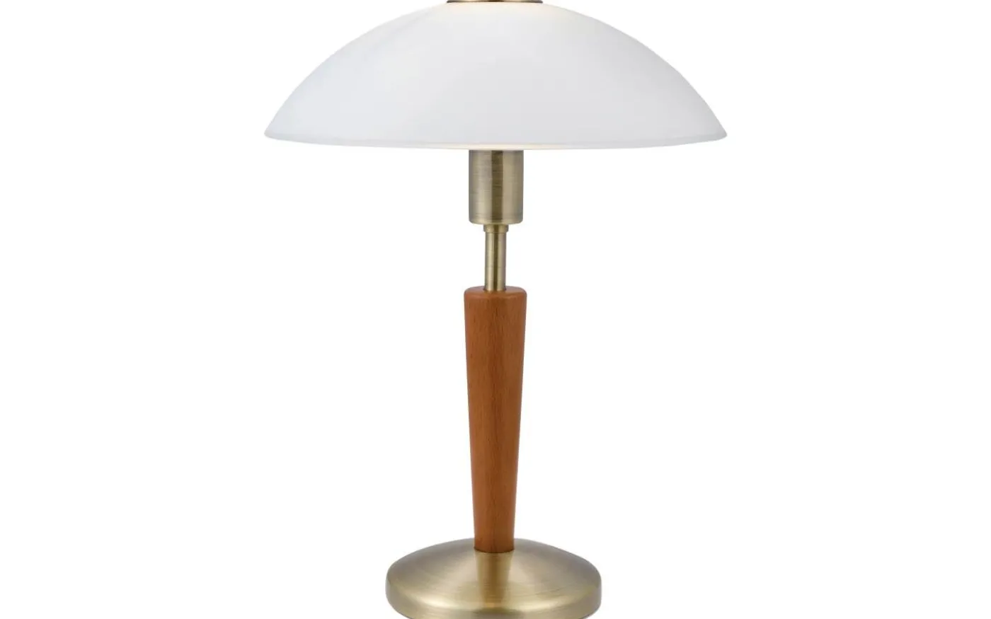 Denna bordsarmatur från serien SOLO 1 är gjord av bronserat stål, trä i valnöt och vitsatinerat glas. Den har skyddsisolering och behöver en E14-lampa för att lysa. Den kan slås på/av och dimras genom att trycka på den specialdesignade ”Touch Me”