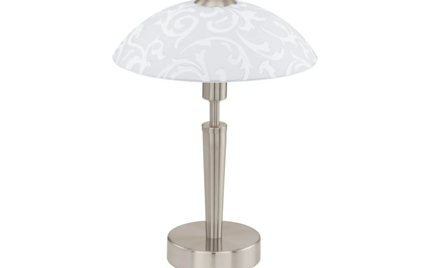 SOLO bordslampa har en sockel i matt nickelmetall och en rund lampskärm i vit satinglas präglad med dekorativa element. Med sin enkla design smälter produkten sömlöst med nästan alla interiörer och kan enkelt slås på och av genom att röra vid ”touch me”-zonen på basen. Oavsett om det står på ett nattduksbord eller i vardagsrummet eller hallen, ger den modern belysning för alla interiörer.