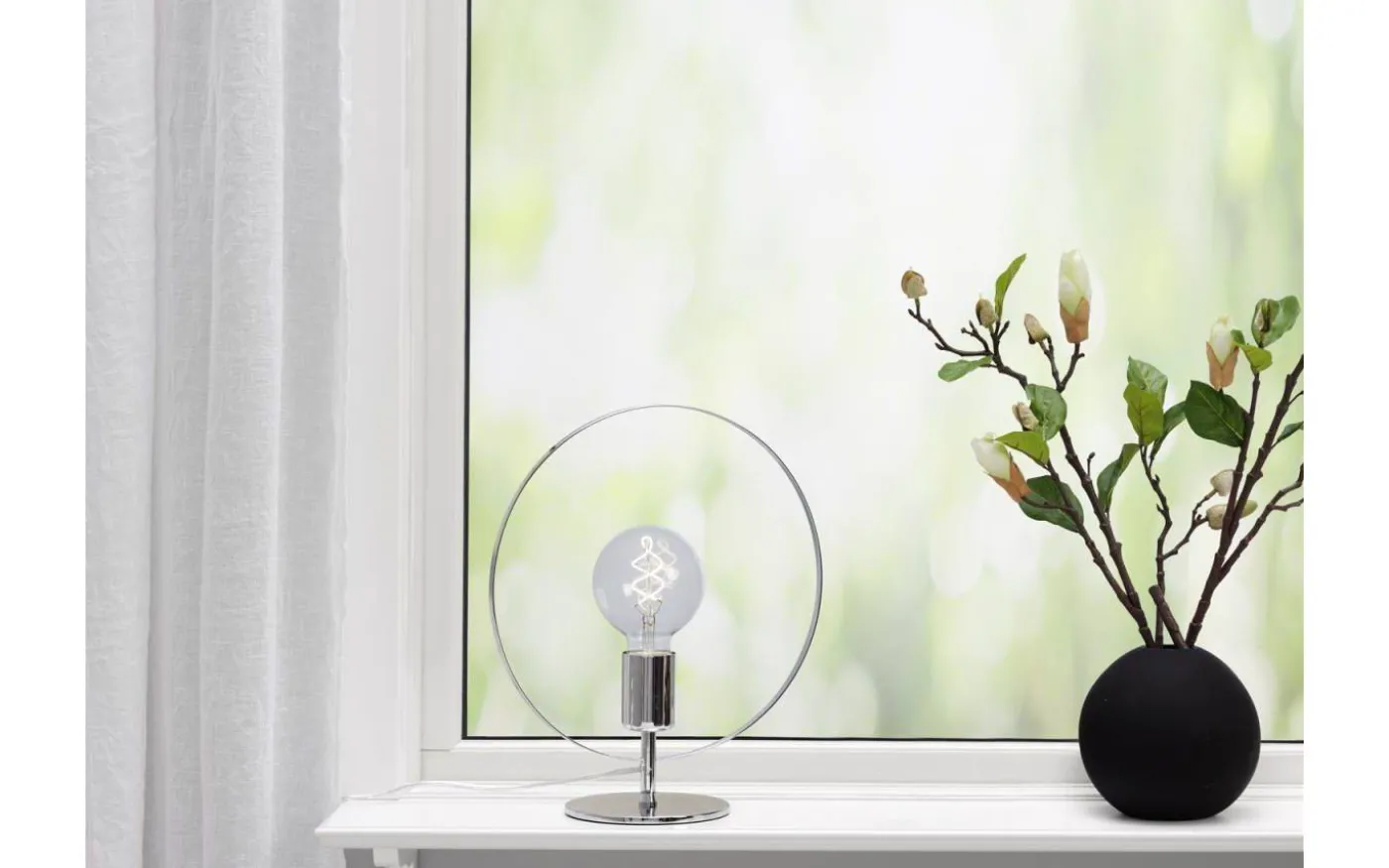 Fina Spartan Ringo bordslampa, från Cottex, är en modern bordslampa i kromfärgad metall. Spartan Ringo gör sig vackert i fönstret eller som dekorationsbelysning på ett sidobord. Denna bordslampa matchar du bäst med en av våra dekorativa ljuskällor i LED för ett riktigt toppresultat!