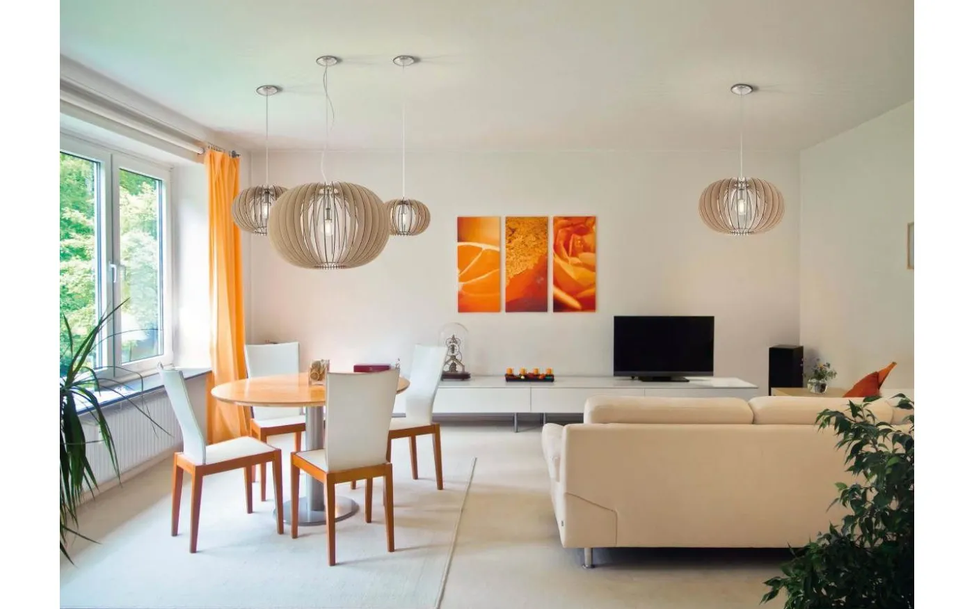 Stellato Taklampa, med en diameter på 70 cm, presenterar en unik design med överlappande träribbor i en ljus brun nyans som skapar en vacker, sfärisk form. Denna lampa ger ett stämningsfullt ljus som sprids genom ribborna och ger ett lekfullt skuggspel på omgivande väggar och tak.