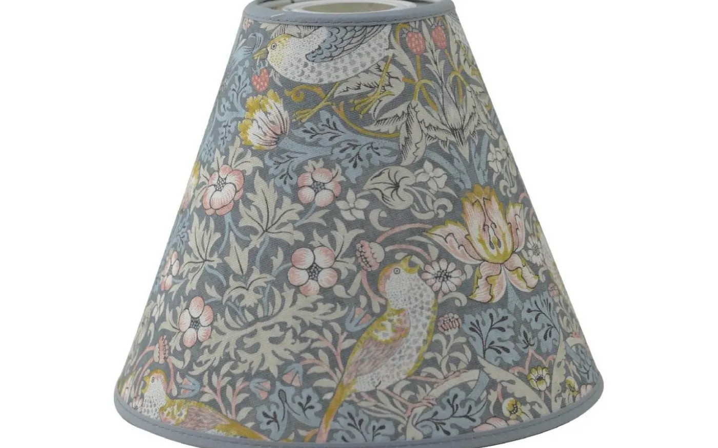 Strawberry Thief Toppringsskärm Ø22cm i färgen Slate från William Morris. En stilfull lampskärm med det ikoniska mönstret av fåglar och bär, här i mjuka blågrå toner som ger en harmonisk och tidlös känsla. Skärmen är anpassad för golvlampor med toppring och blir en elegant detalj som sprider ett vackert, stämningsfullt ljus i rummet.