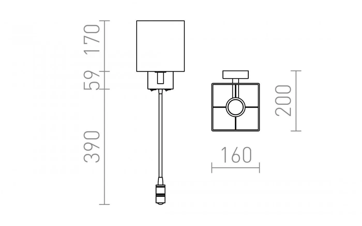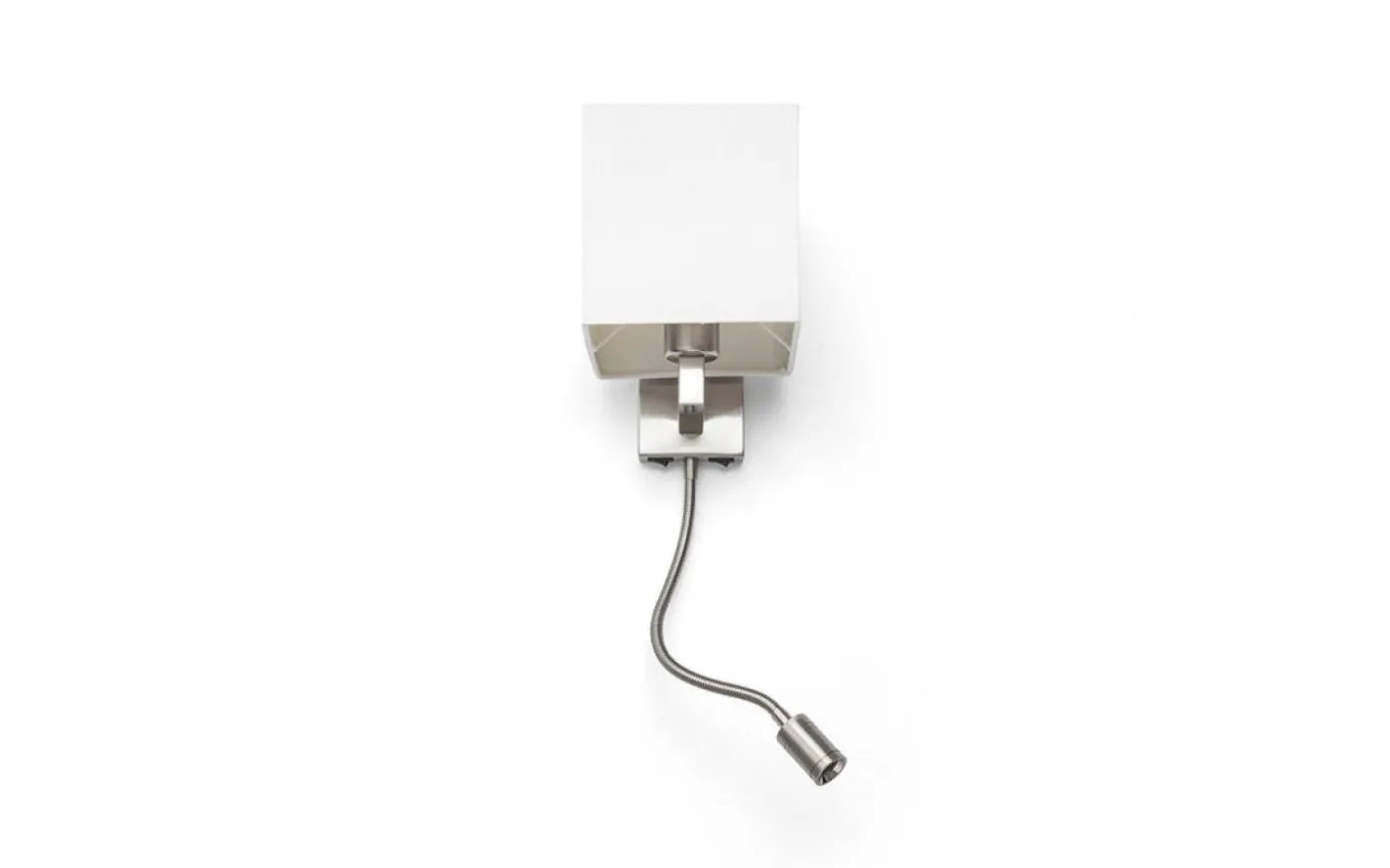 Vägglampa med textilskärm och LED-läslampa på svanhals. Båda ljuskällorna kan tändas individuellt med knappar som sitter på den kantiga basen.