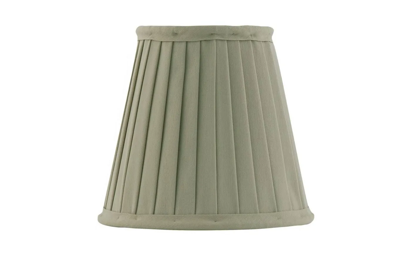 Klassisk textilskärm i veckat bomullstyg med en klämfattning för E14-lampor. Olivgrön bomullstextil 12×14 cm Klämfattning