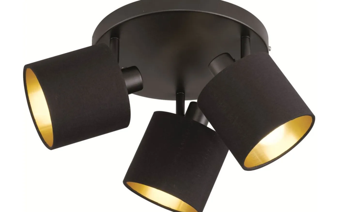 Spotlighterna i TOMMY-serien ger mysig belysning, då textilskärmar ökar komfortfaktorn och frammanar en mysig atmosfär. Samtidigt frammanar de tydliga formerna en modern och enkel stil som kan användas och kombineras på en mängd olika sätt. Spotlighten med tre lågor har en diameter på 25 cm och är idealisk för att belysa små bostadsutrymmen. De vridbara huvudena kan också justeras för att avsiktligt framhäva enskilda områden. Armaturen är tillverkad av mattsvart metall och kompletteras av tre tygskärmar i den moderna färgkombinationen svart och guld. Kombinationen skapar snygga ljusaccenter och ger bostadsutrymmen en extraordinär välbefinnandeeffekt. För energibesparande belysning rekommenderas att använda en LED-lampa. Dessa är ett optimalt alternativ till konventionella halogenlampor och står för hög ljuskvalitet och energibesparingar på upp till 80 %. Dessutom hjälper LED-lampor dig att dra nytta av lång livslängd, låg värmeutveckling och samtidigt skydda miljön. Ljuskälla: exklusiv 3x E14 · max. 28W. Extra information: Takmontering, IP20, Lampa(or) ingår ej