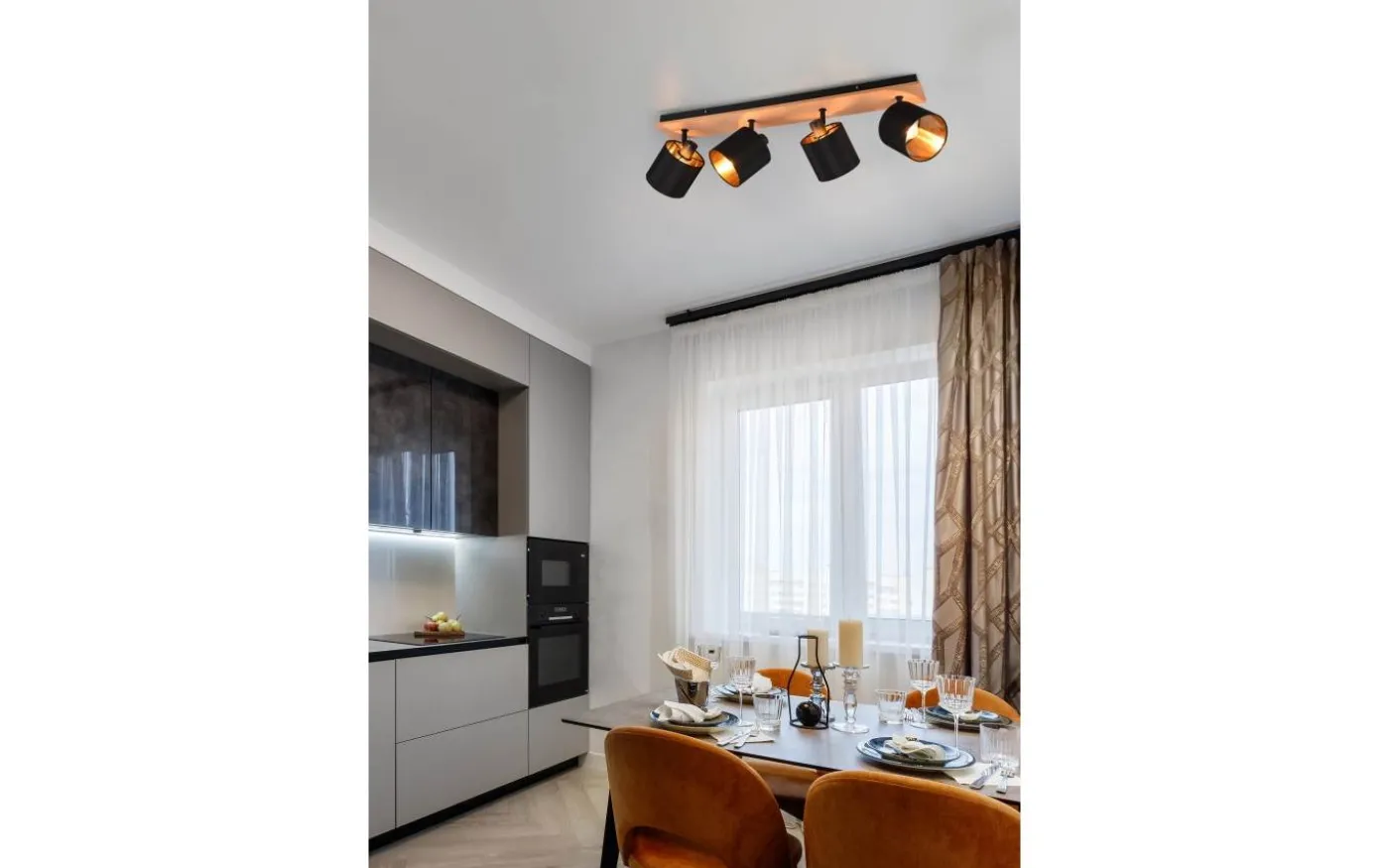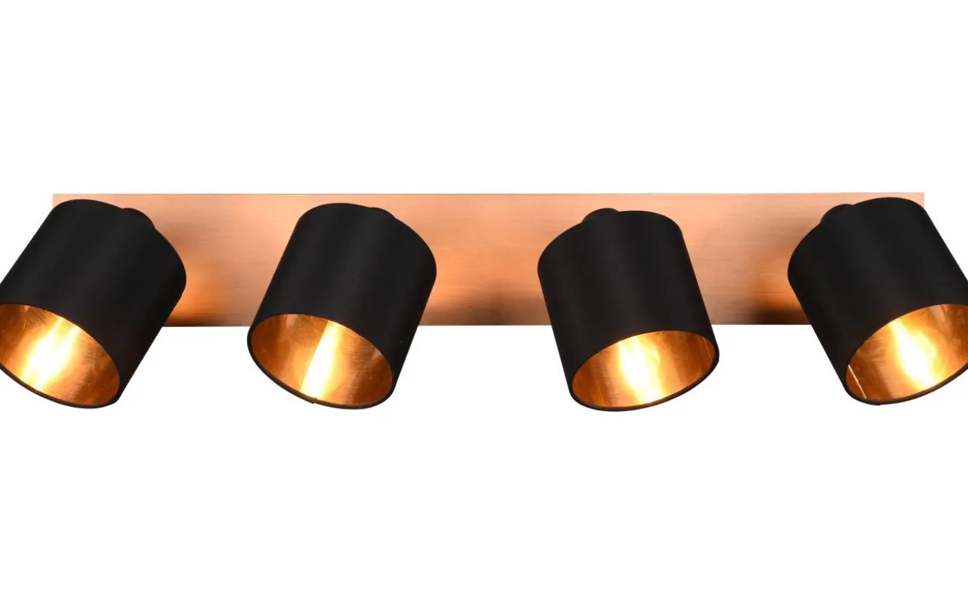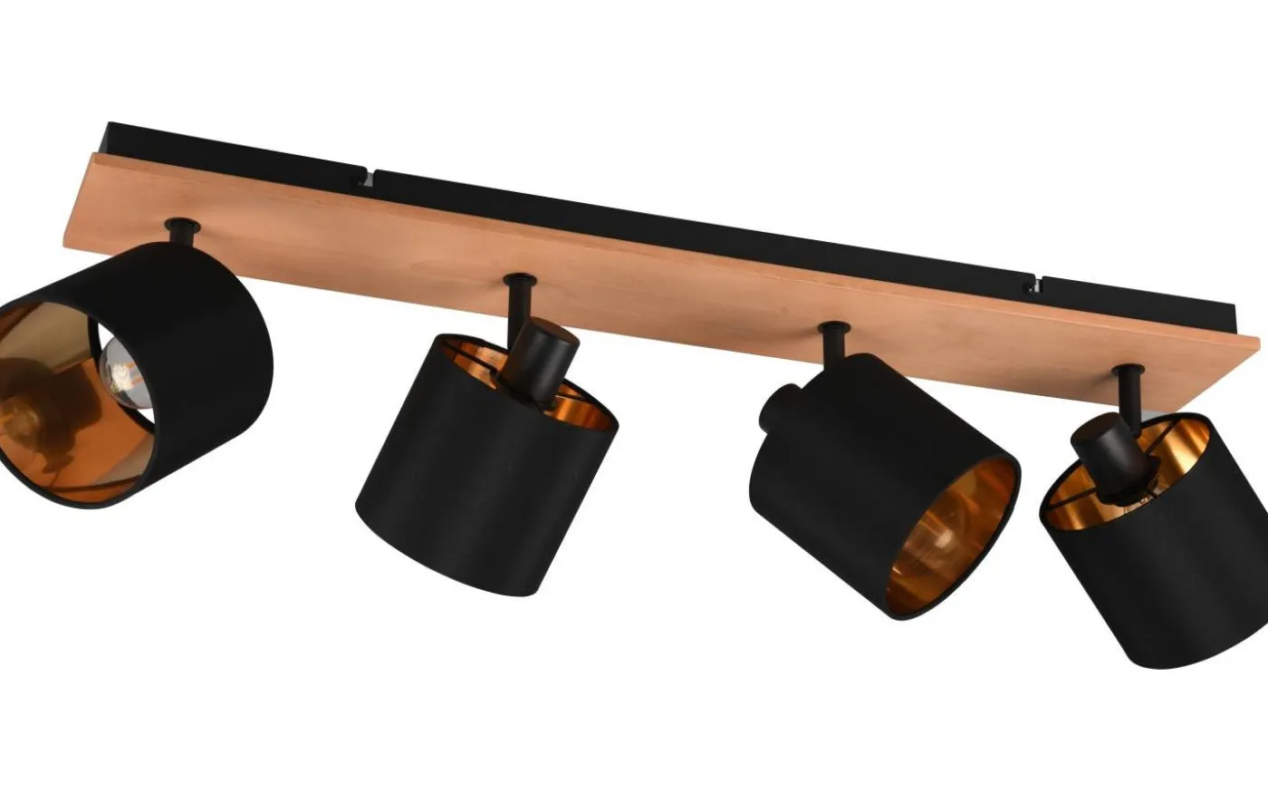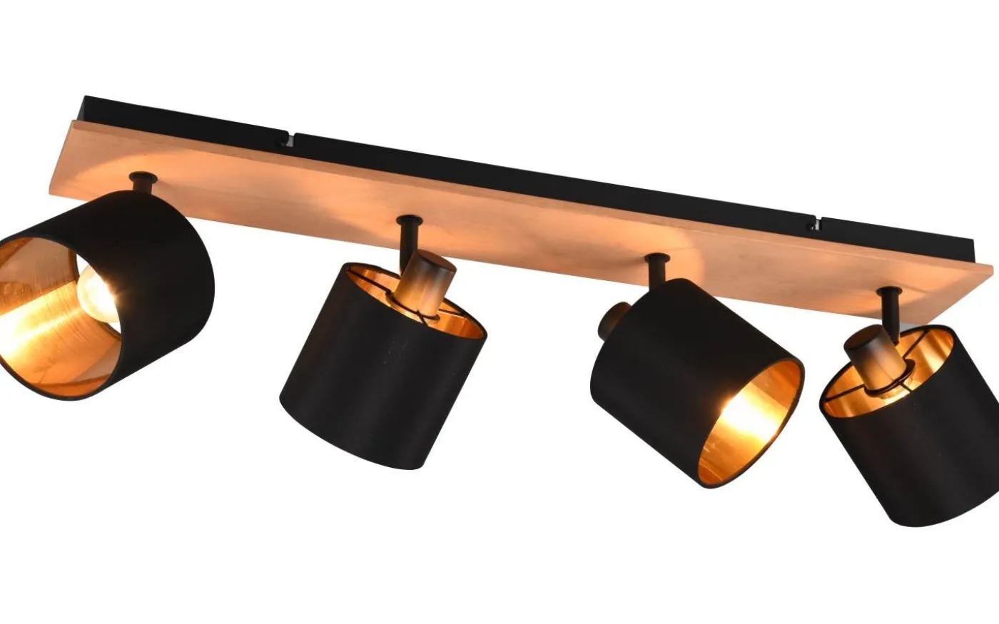 Spottarna i TOMMY-serien står för ett hemtrevligt ljus, då textilskärmar ökar komfortfaktorn och frammanar en mysig atmosfär. Samtidigt frammanar de tydliga formerna en modern och enkel stil som kan användas och kombineras på många olika sätt. Spottlampan med fyra lampor kan användas som kompletterande eller orienteringsbelysning såväl som för små vardagsrum. De vridbara lamphuvudena kan justeras målinriktat för att medvetet skapa en miljö för enskilda områden. Lampan är tillverkad av svart matt metall och kompletteras av en tygskärm i den moderna färgkombinationen svart och guld. Den extra kombinationen med trä skapar snygga accenter och ger bostadsutrymmen en extraordinär välbefinnandeeffekt. För modern och pålitlig belysning rekommenderas en LED-lampa. Den erbjuder hög ljuskvalitet, är mångsidig och övertygar med jämn belysning. Dess långa livslängd och låga värmeutveckling gör den till det perfekta valet för en mängd olika användningsområden. Ljuskälla: exklusiv 4x E14 · max. 28W. Extra information: Takmontering, IP20, Lampa(or) ingår ej
