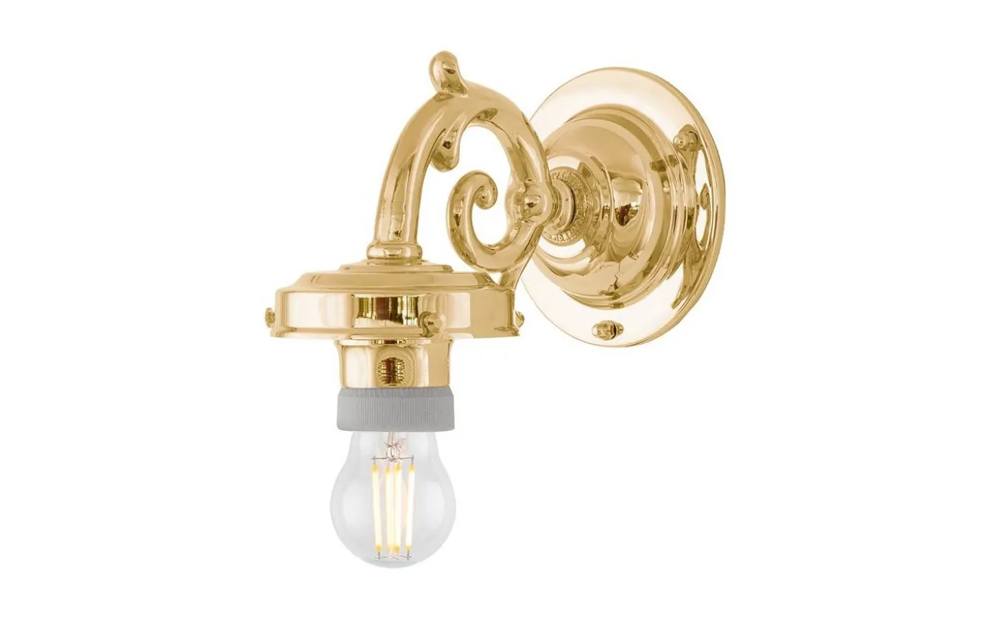 Klassisk väggarmatur tillverkad helt i mässing. Placeras lämpligen ovanför, eller på var sin sida om en badrumsspegel. För fast montage. För att gå in med kuloledning kompletteras med en distansplatta.