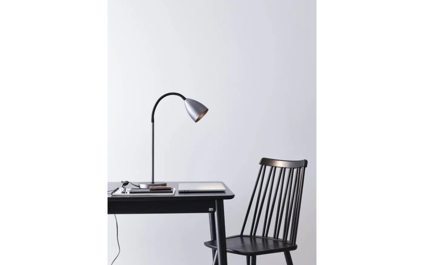 Lamphuvudet är placerat på en flexarm som gör att du enkelt kan vinkla och rikta ljuset efter eget önskemål. Skrivbordslampans höjd varierar mellan 33-63 cm beroende på hur den är vinklad. Tänder och släcker gör du enkelt på strömbrytaren som är placerad på sladden. Denna modell har en industriell, oxidgrå finish med svart detalj över flexarmen.