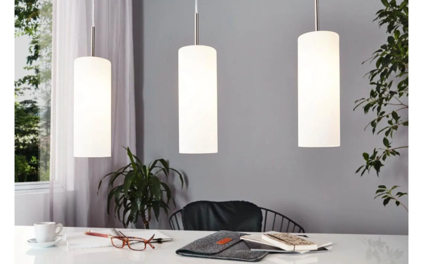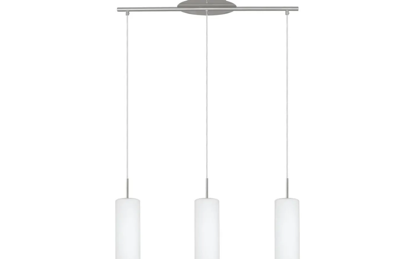 TROY 3 taklampa är gjord av metall i en matt nickelfinish och har tre upphängda cylindriska lampskärmar av vitt satinglas. Den enkla designen fungerar bra med nästan alla inredningsstilar och skapar mysig belysning i alla utrymmen, oavsett om det är i vardagsrummet eller matsalen.