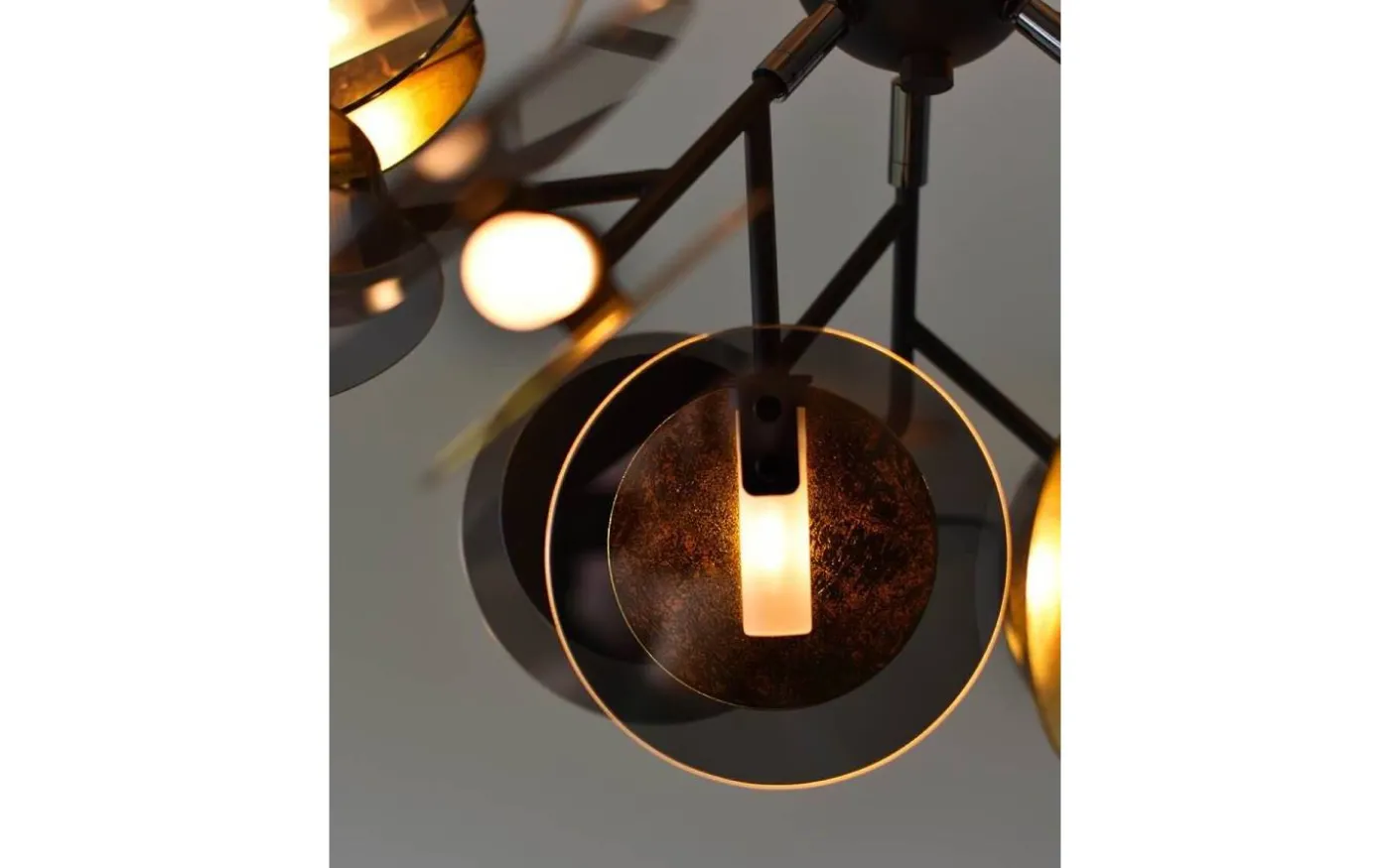 Turno taklampa från By Rydéns är gjord i svarta glas med baksida i metall med insida av bladguldsfinish. Den guldiga insidan reflekterar ljuset vackert och ljuskällan placeras innanför ett rör i frostat glas som ger ett bländskydd.