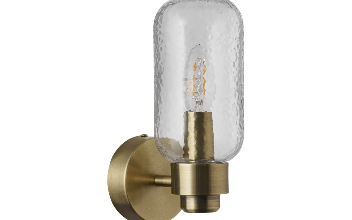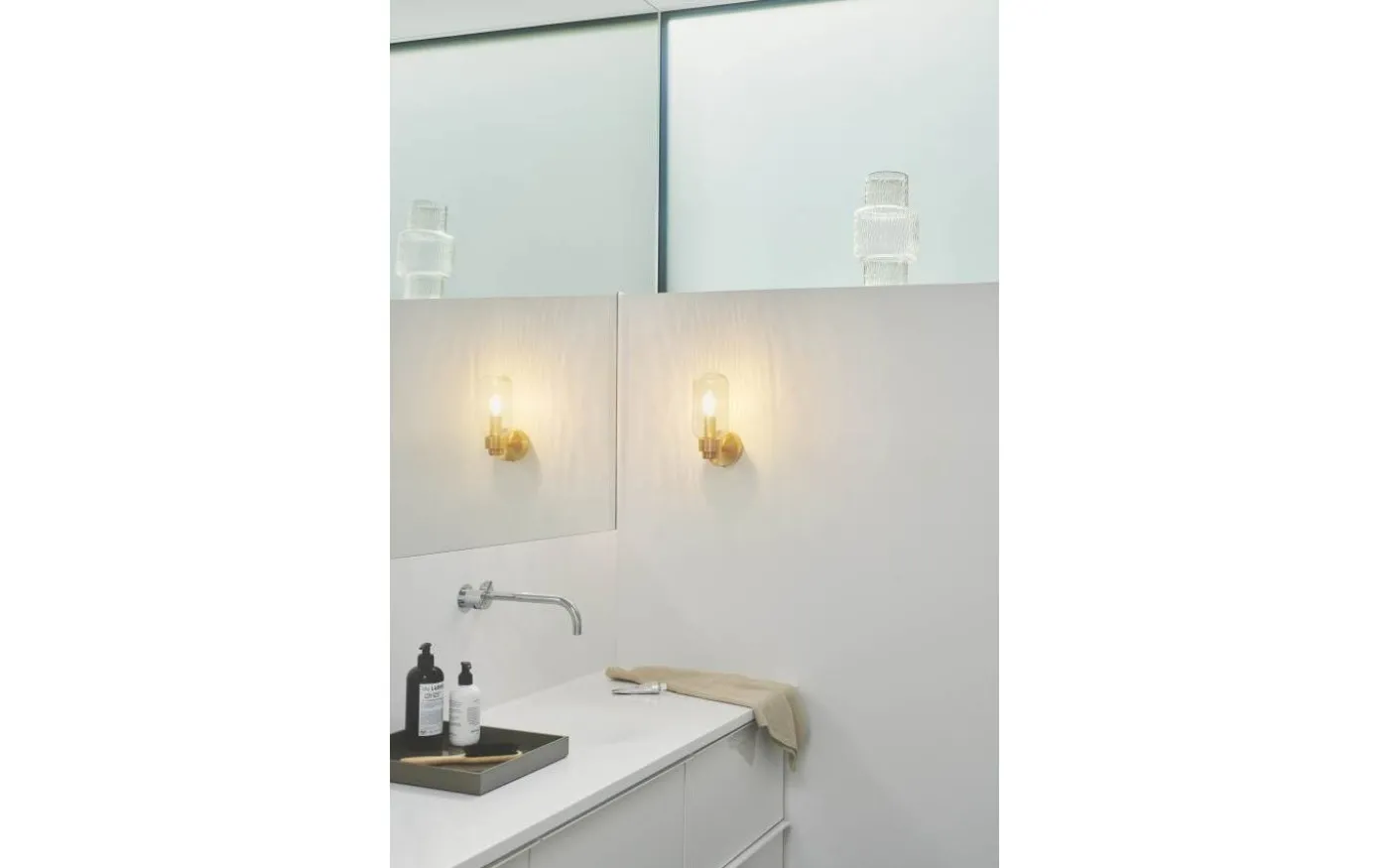 Tutan har en elegant, rundad design med tydliga Art Deco-referenser. Det mönstrade glaset ger ett behagligt ljus som passar perfekt bredvid badrumsspegeln.
