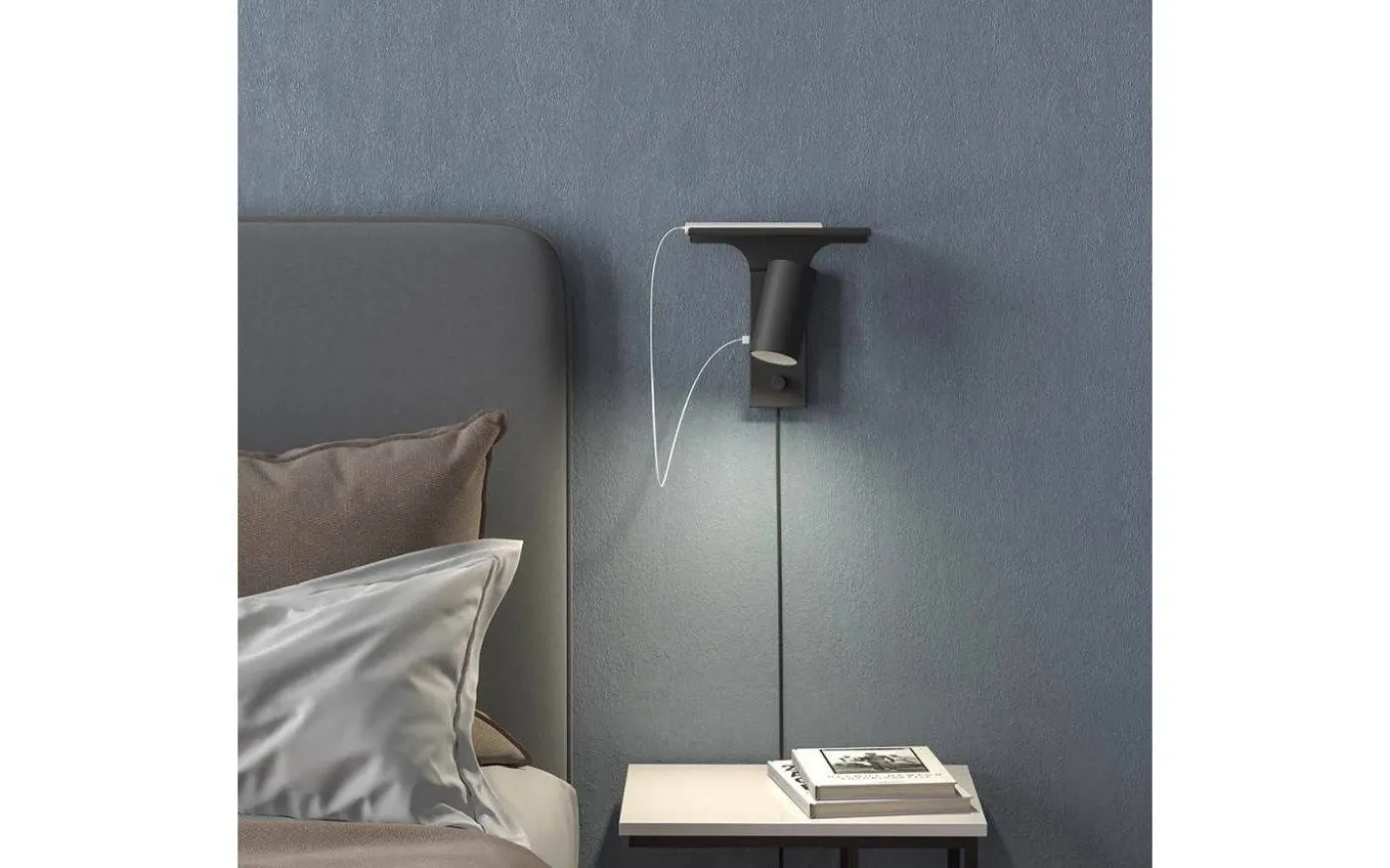 Vägglampan i metall har en stilren design med justerbart lamphuvud och ett USB-C uttag på höger sida.
