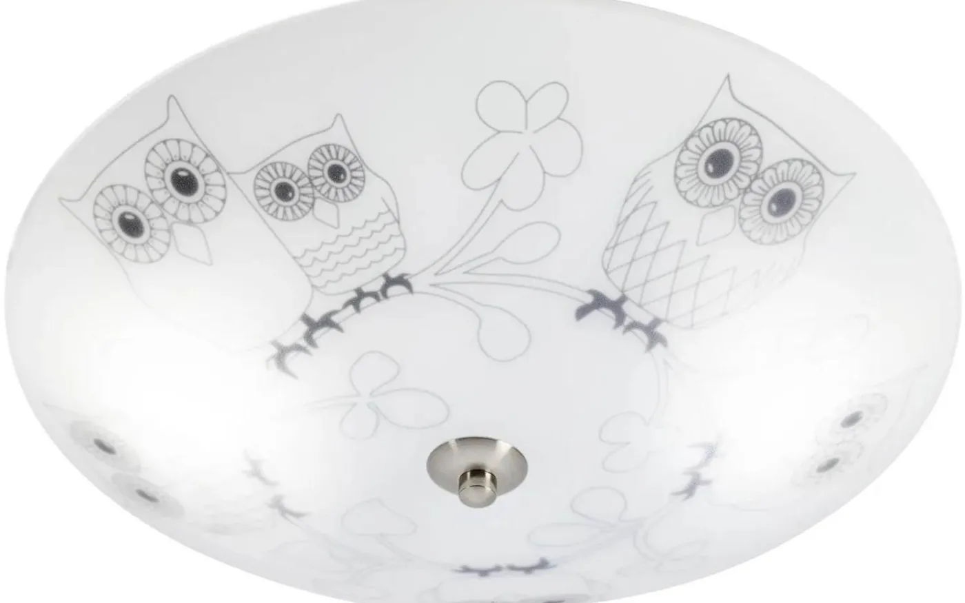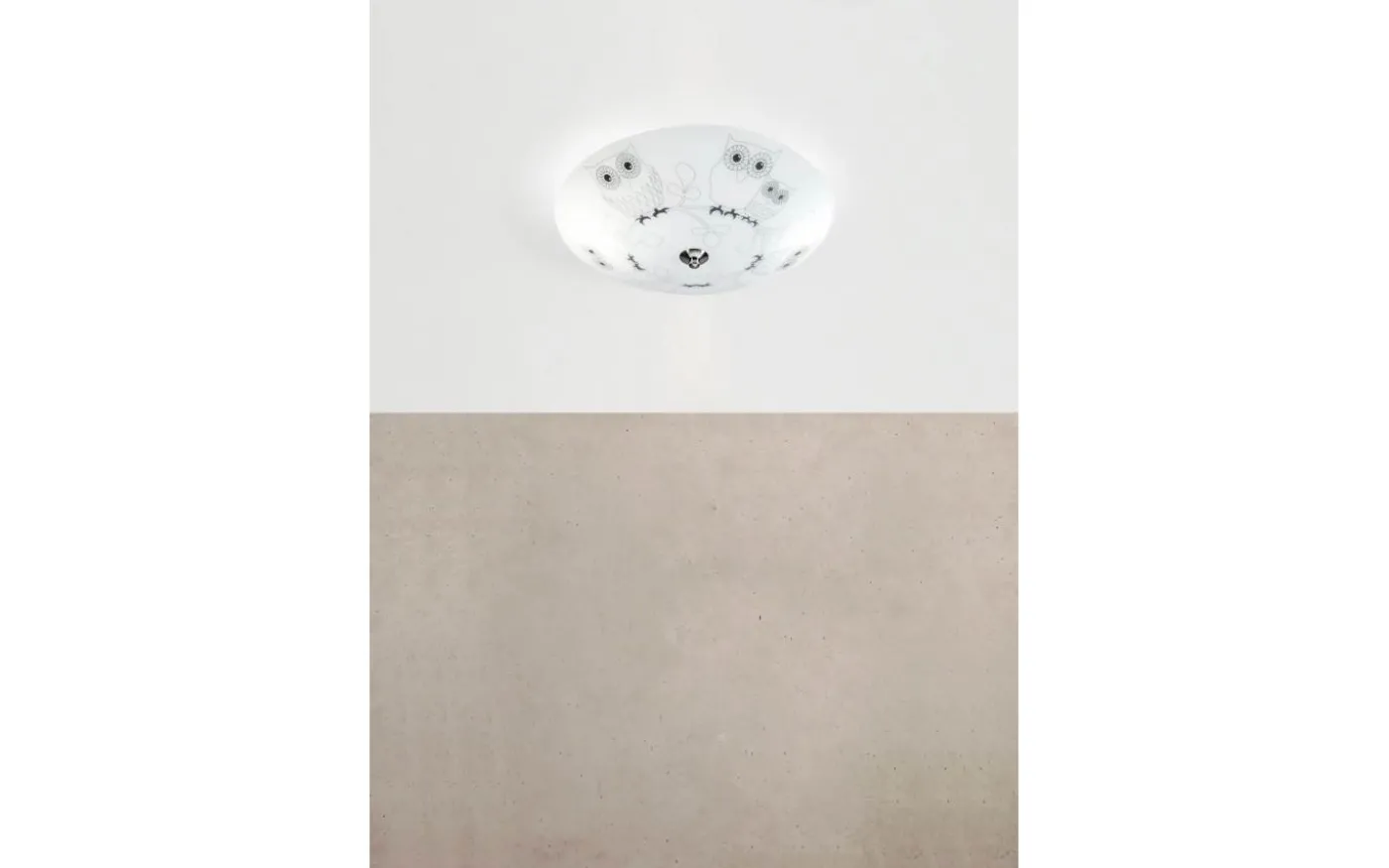 Glasplafond med frostad look och lekfullt mönster med ugglor. Glaset släpper igenom ett behagligt allmänljus som passar perfekt i barnrummet. Totalhöjd om 13 cm gör att lampan passar även i rum med lägre takhöjd. Diameter om 39cm. Finns även i flerfärgat mönster.