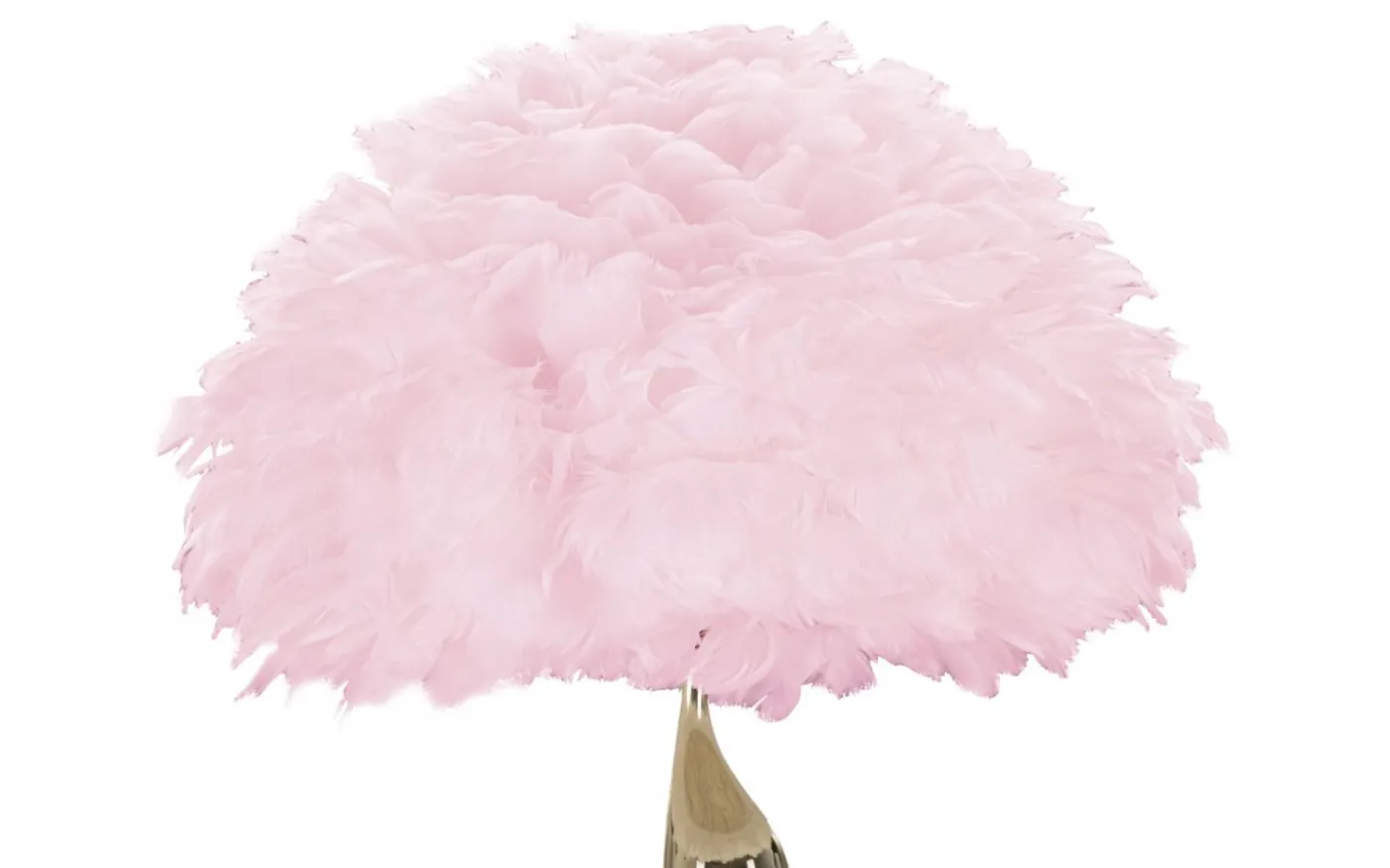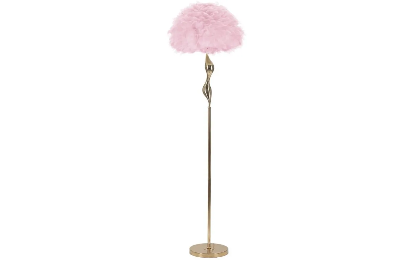 Golvlampa i gyllene metall med elegant mjuk och slingrande dekoration komplett med lampskärm av fjädrar.