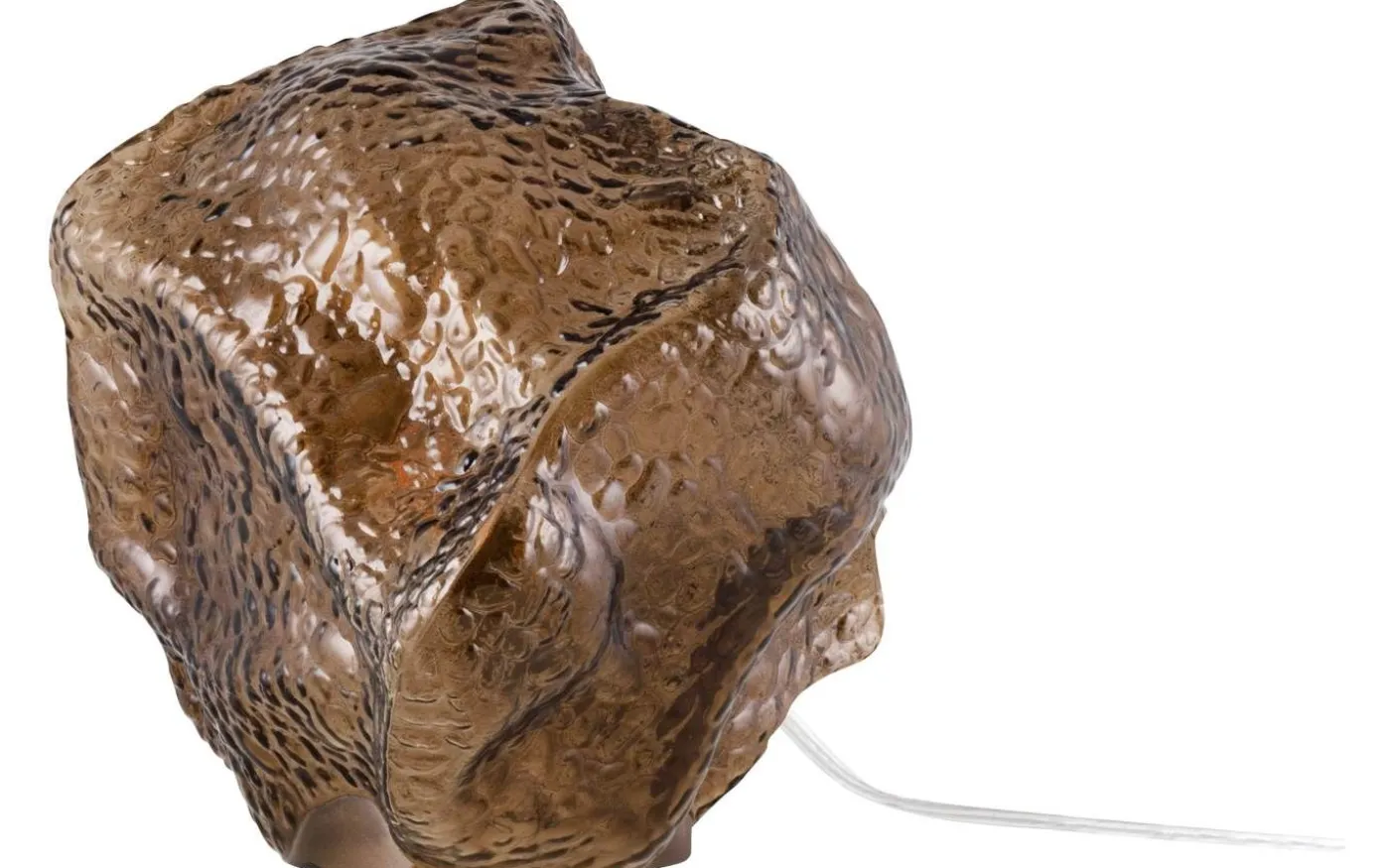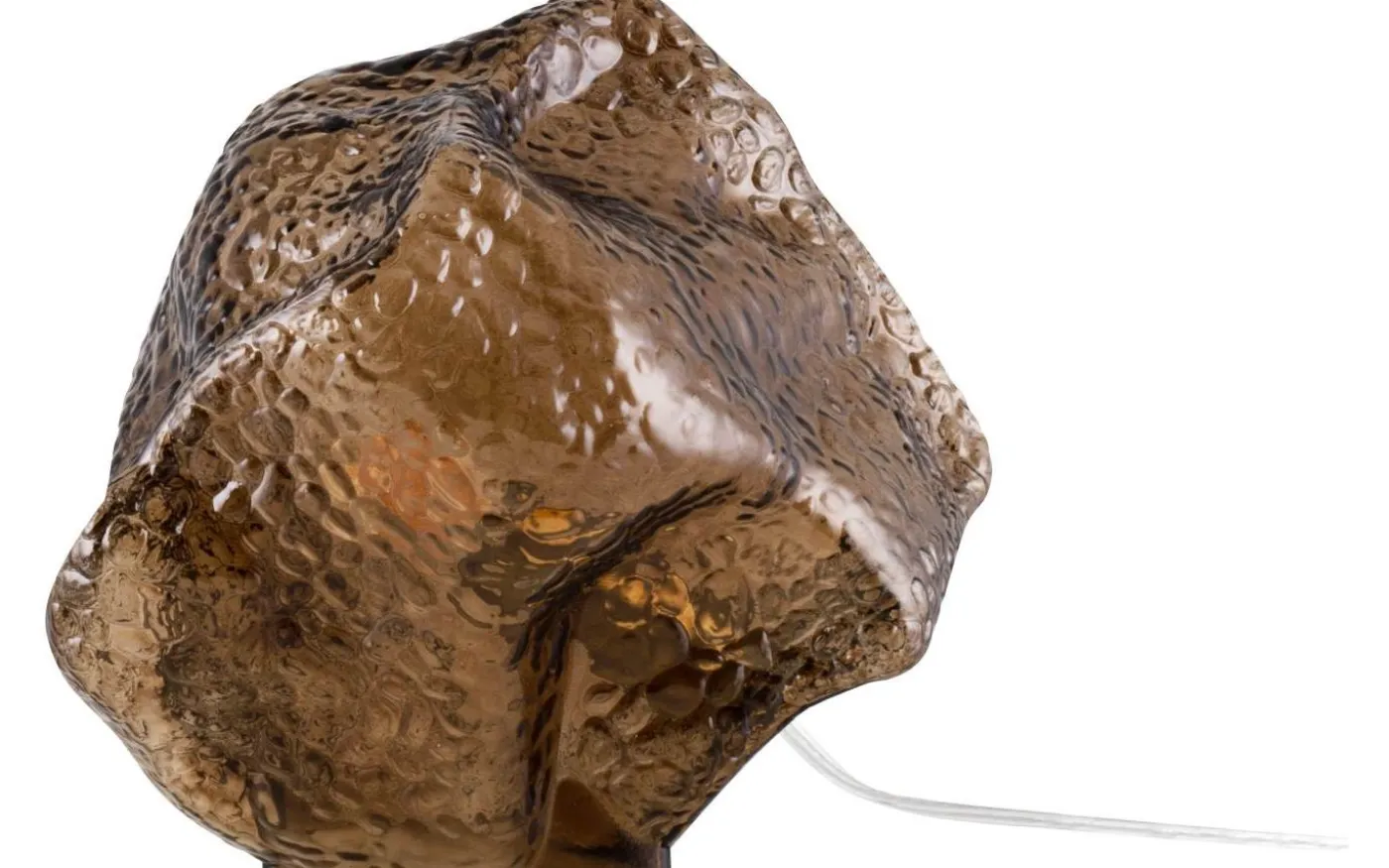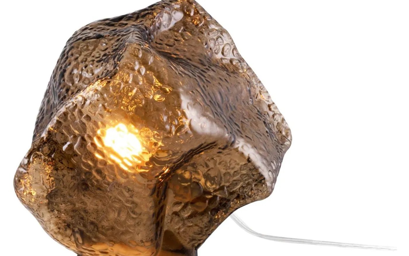 Valerie från Globen Lighting är en bordslampa med form som en sten och ett glas som fångar ljuset med sin strukturerade yta. Det munblåsta glaset gör varje lampa unik i tjocklek och färg, och med detaljer i borstad mässing ger en klassisk touch.
