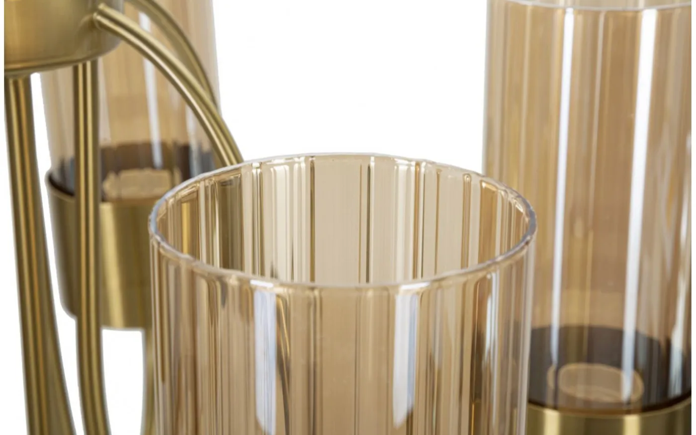 Taklampa i gyllene metall med enkla och väsentliga linjer med 5 ljuspunkter i gyllene metall och glas.