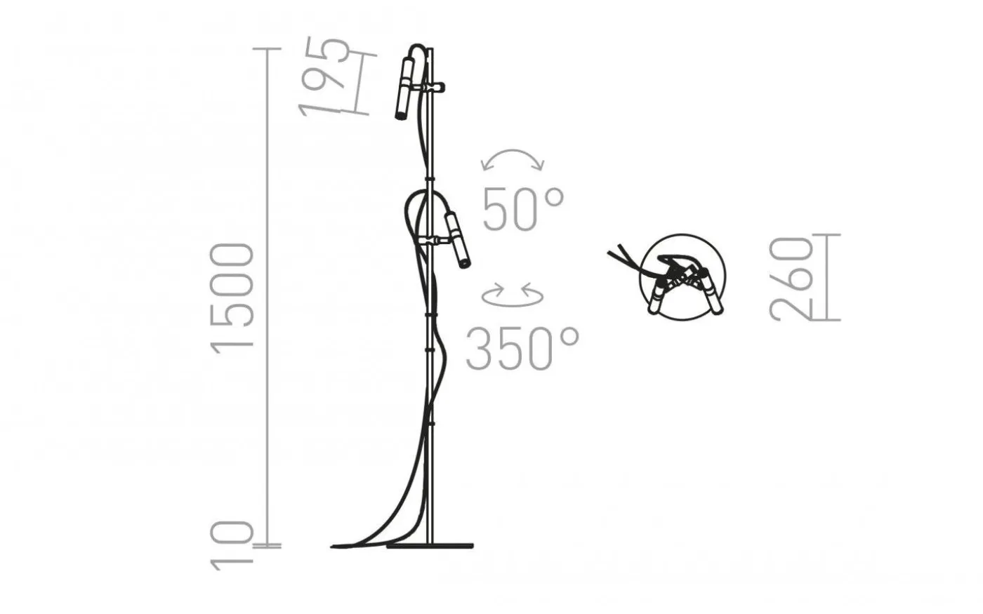 Kromfärgad golvlampa med två justerbara svarta LED-reflektorer, som har varsin anslutningskabel av röd textil, med brytare och kontakt på vardera.