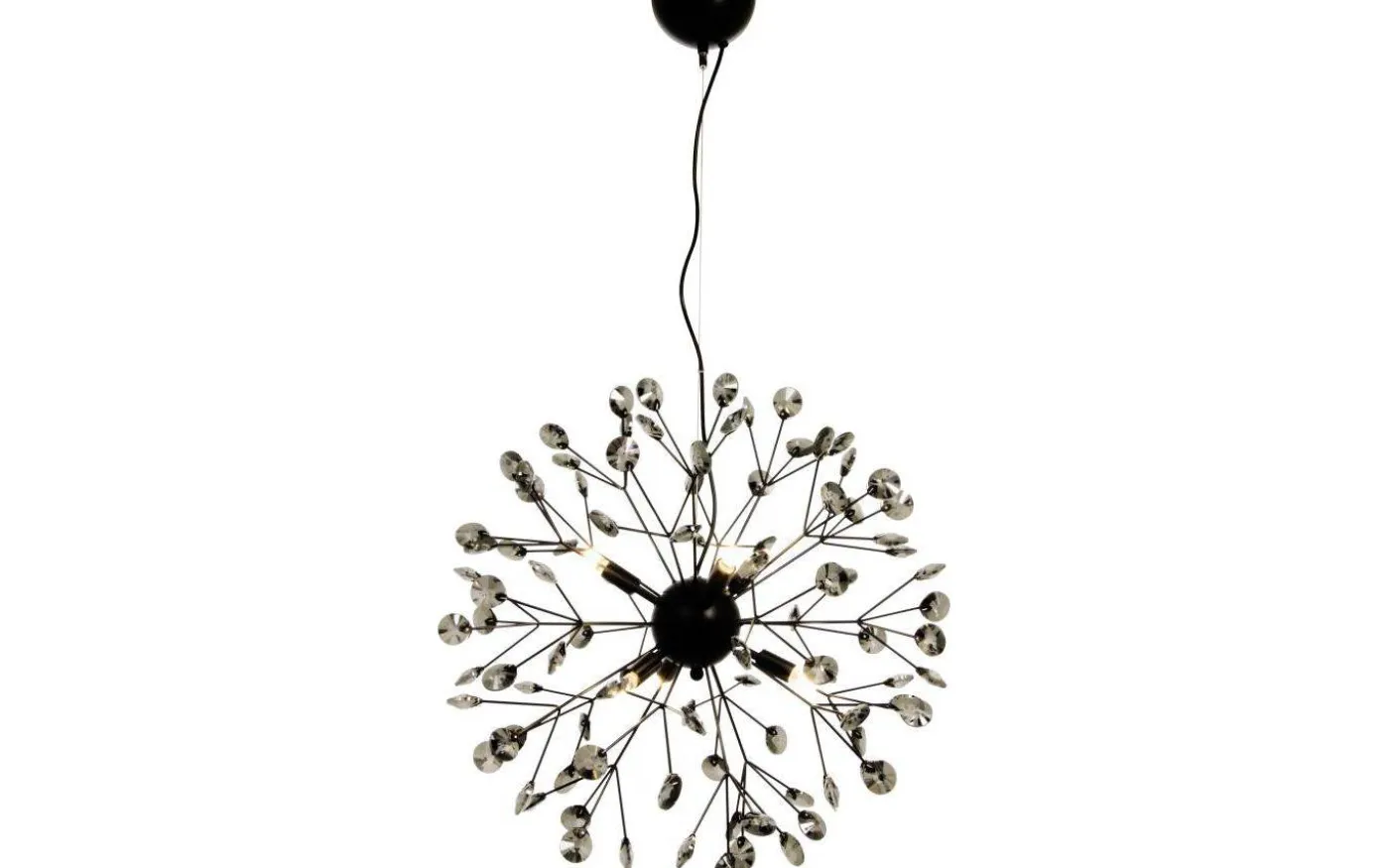 Viva taklampa i svart metall kombinerad med dekorativa sotade prismor / kristaller som är genomgående i hela lampan. Lampan är för 6 x 25W G9 och sprider ett spektakulärt ljus genom kristallerna när lampan är tänd, ljuskällor ingår ej. Takkopp av metall. Krokupphäng med kopplingsplint, lamppropp kan monteras.
