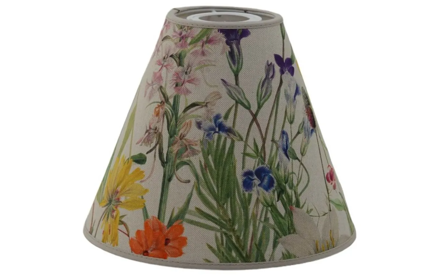 Wildflower Sunny Field lampskärm från välkända Hallbergs Lighting of Sweden är en vacker toppringskärm i textil med härligt motiv och kantband i ovan- och nederkant.