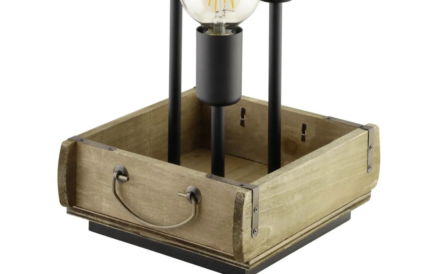 Bordslampan WOOTTON har en fyrkantig trälåda i vintagestil och tre lamphållare i olika höjder gjorda av svart metall. Lamphållarna har en exponerad glödlampsdesign som förstärker retrostilen. Bordslampan kan enkelt tändas och släckas med hjälp av sladdströmbrytaren. Med sin udda design kompletterar bordslampan moderna inredningsstilar och ger ett iögonfallande inslag på nattduksbordet, i vardagsrummet, matsalen eller hallen.