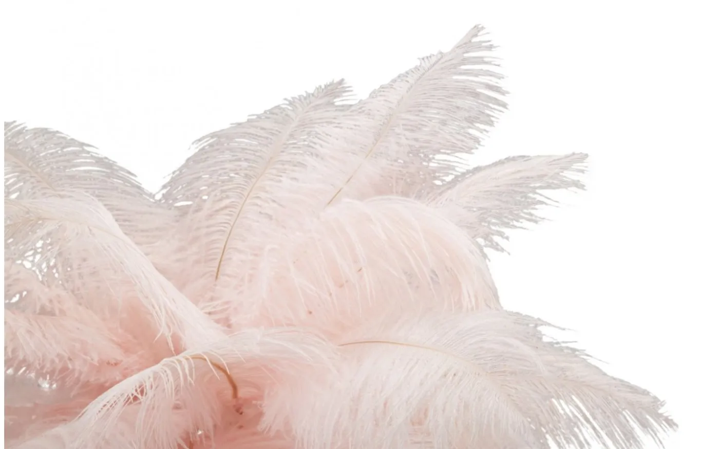 Bordslampa i gyllene metall med 2 ljuspunkter och lampskärm uppbyggd av rosa fjädrar.