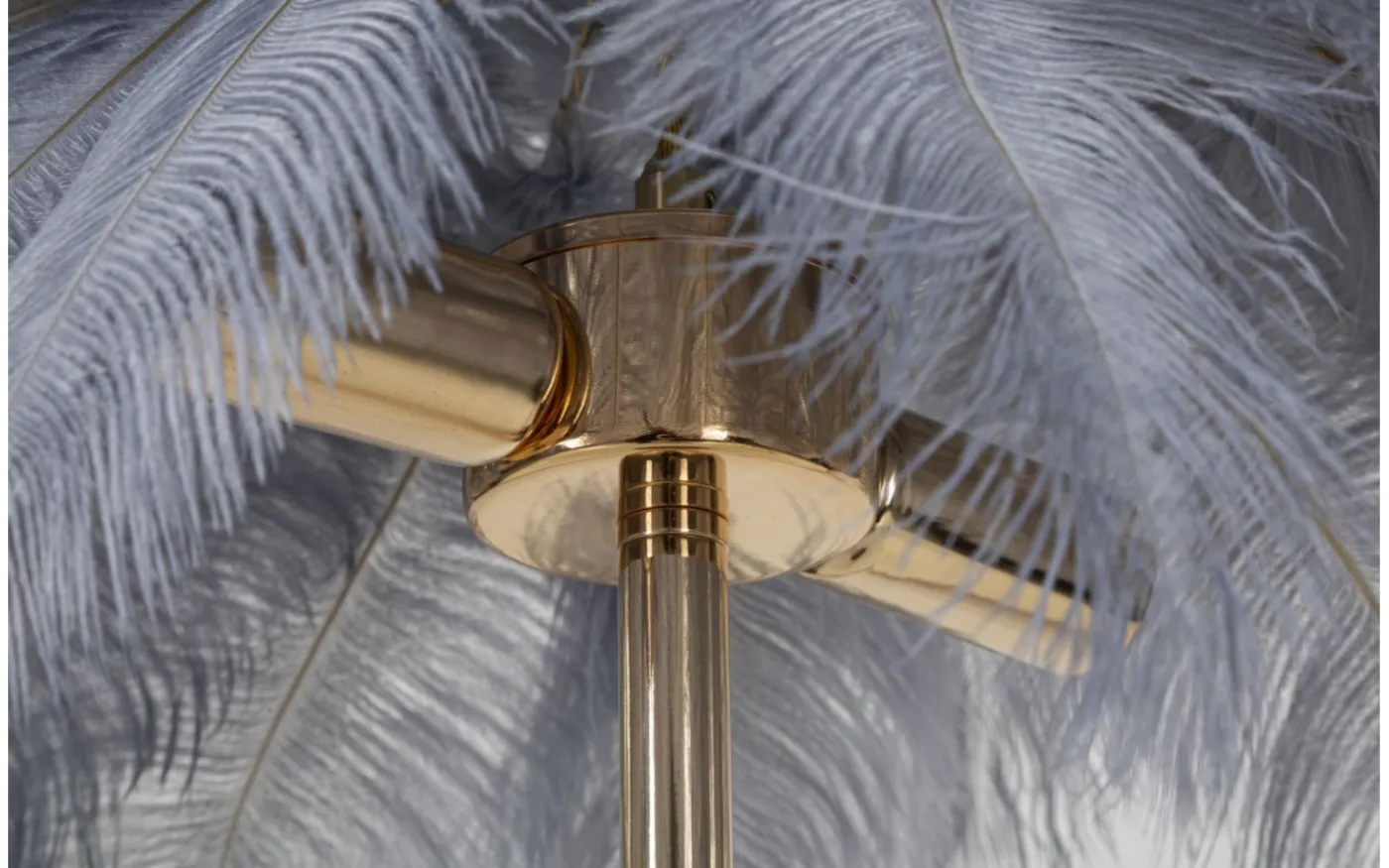 Bordslampa i gyllene metall med 2 ljuspunkter och lampskärm uppbyggd av vita fjädrar.