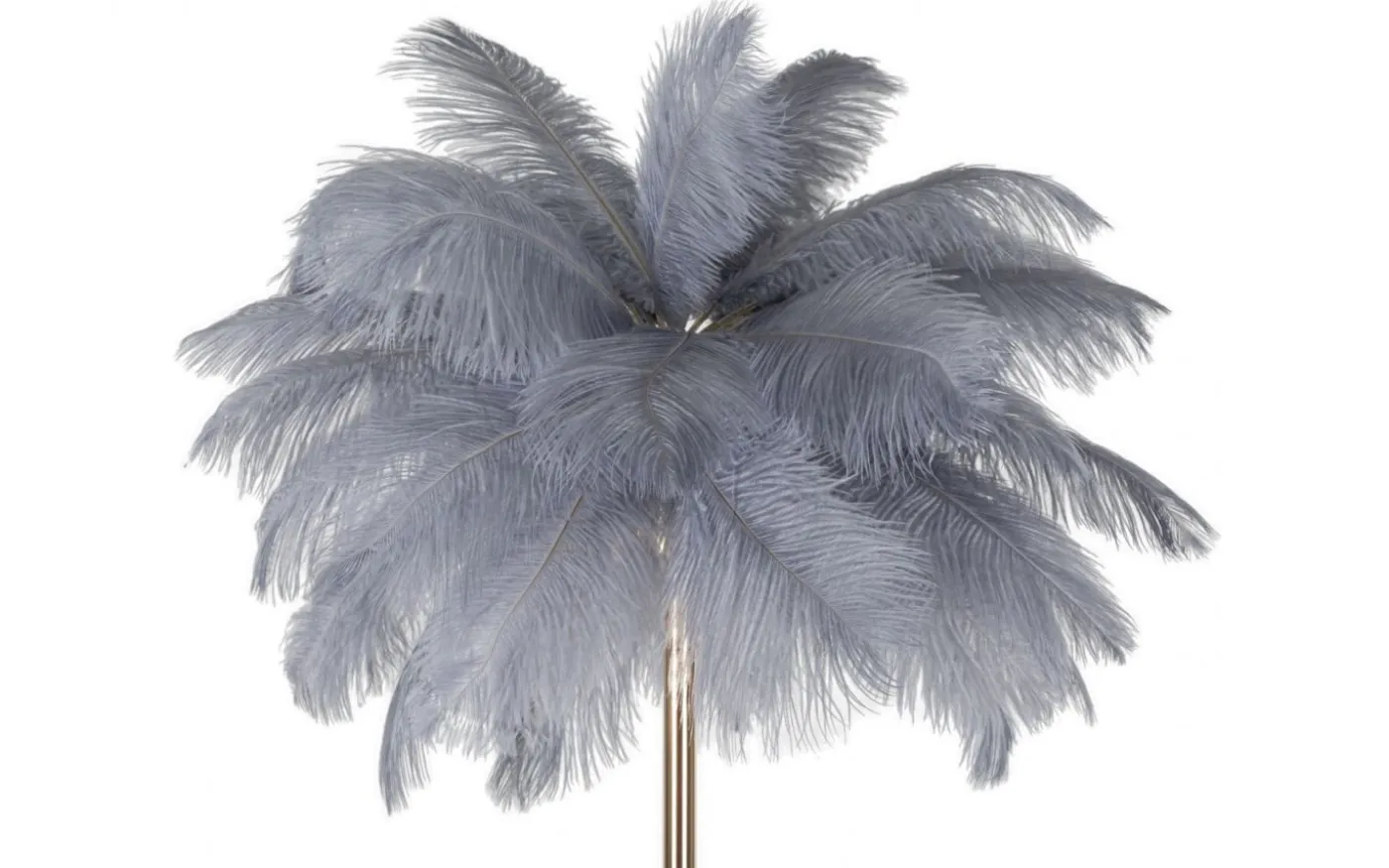Golvlampa i gyllene metall med 3 ljuspunkter och lampskärm uppbyggd av vita fjädrar.