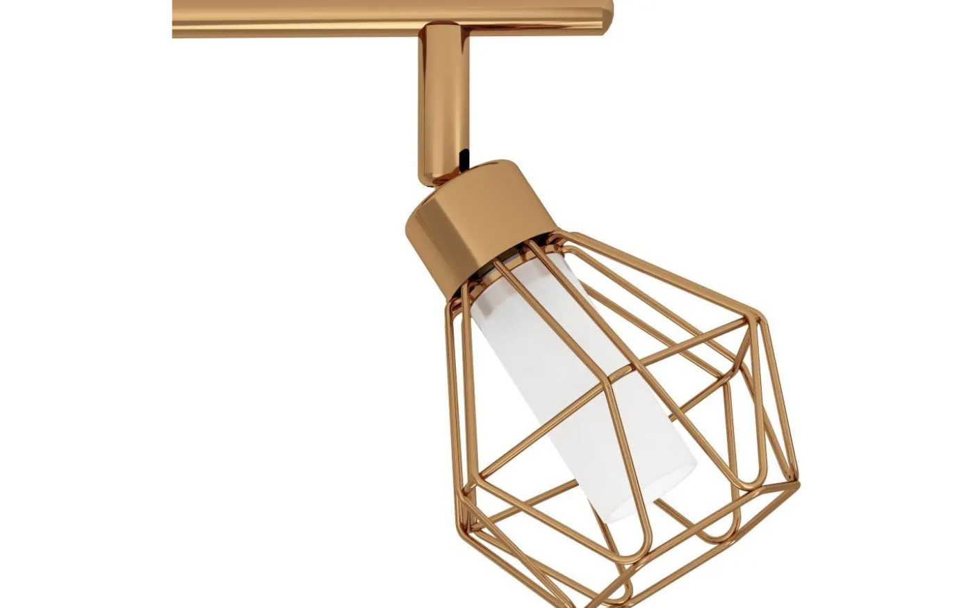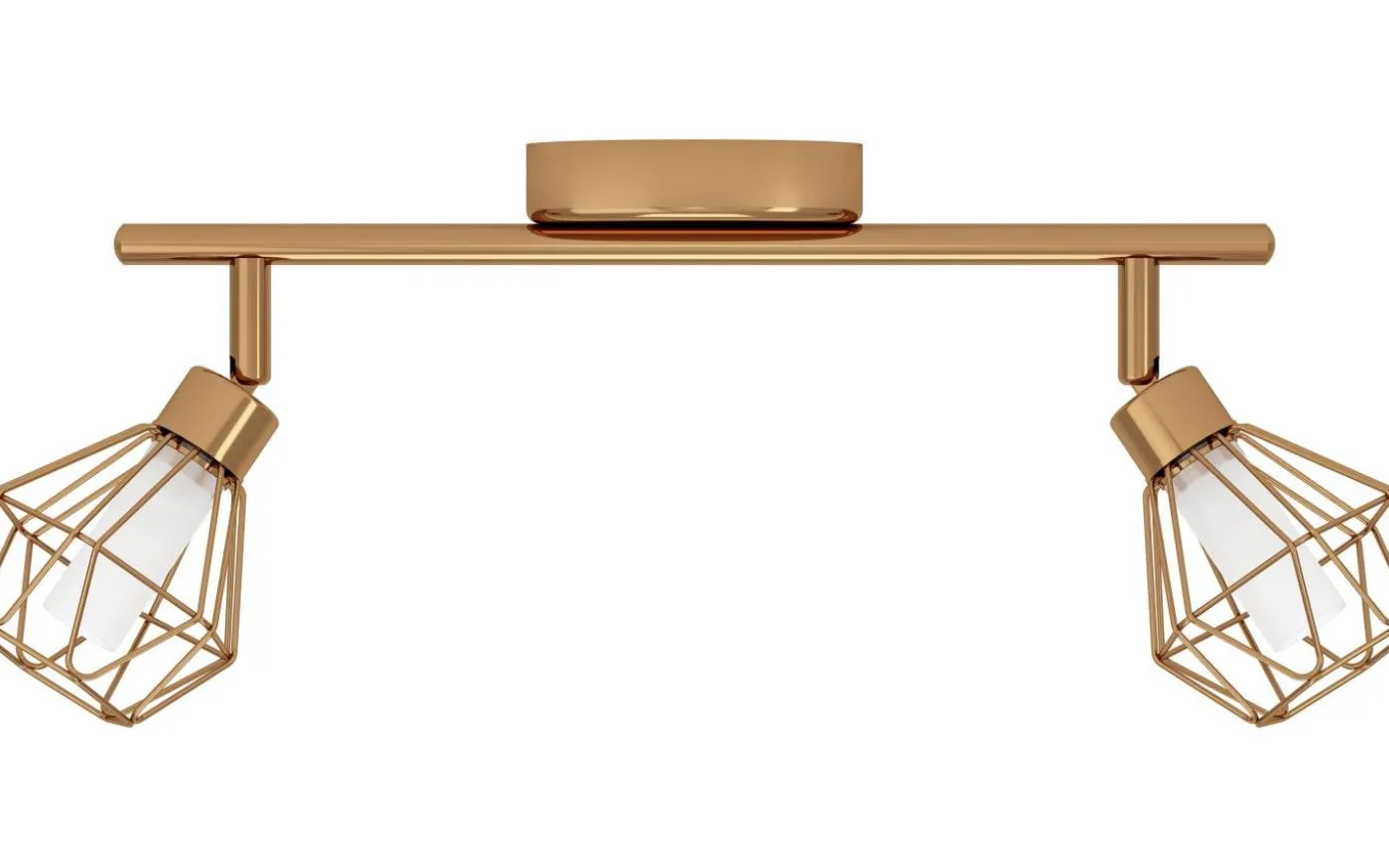 ZAPATA LED-taklampan har en linjär metallkropp i en kopparfärgad finish med två justerbara diamantformade spotlights gjorda av tråd. Varje spotlight har ett inre vitt satinglaselement. Lampskärmarna skapar ett fascinerande spel av ljus och skugga så fort ljuset tänds. Taklampan smälter sömlöst in i moderna interiörer. Designen har vridbara spotlighthuvuden som gör att du kan justera ljuset för att accentuera enskilda delar av rummet, oavsett om det är i köket, vardagsrummet, sovrummet eller hallen. Produkten innehåller G9 LED-lampor, som ger ett behagligt varmvitt ljus.