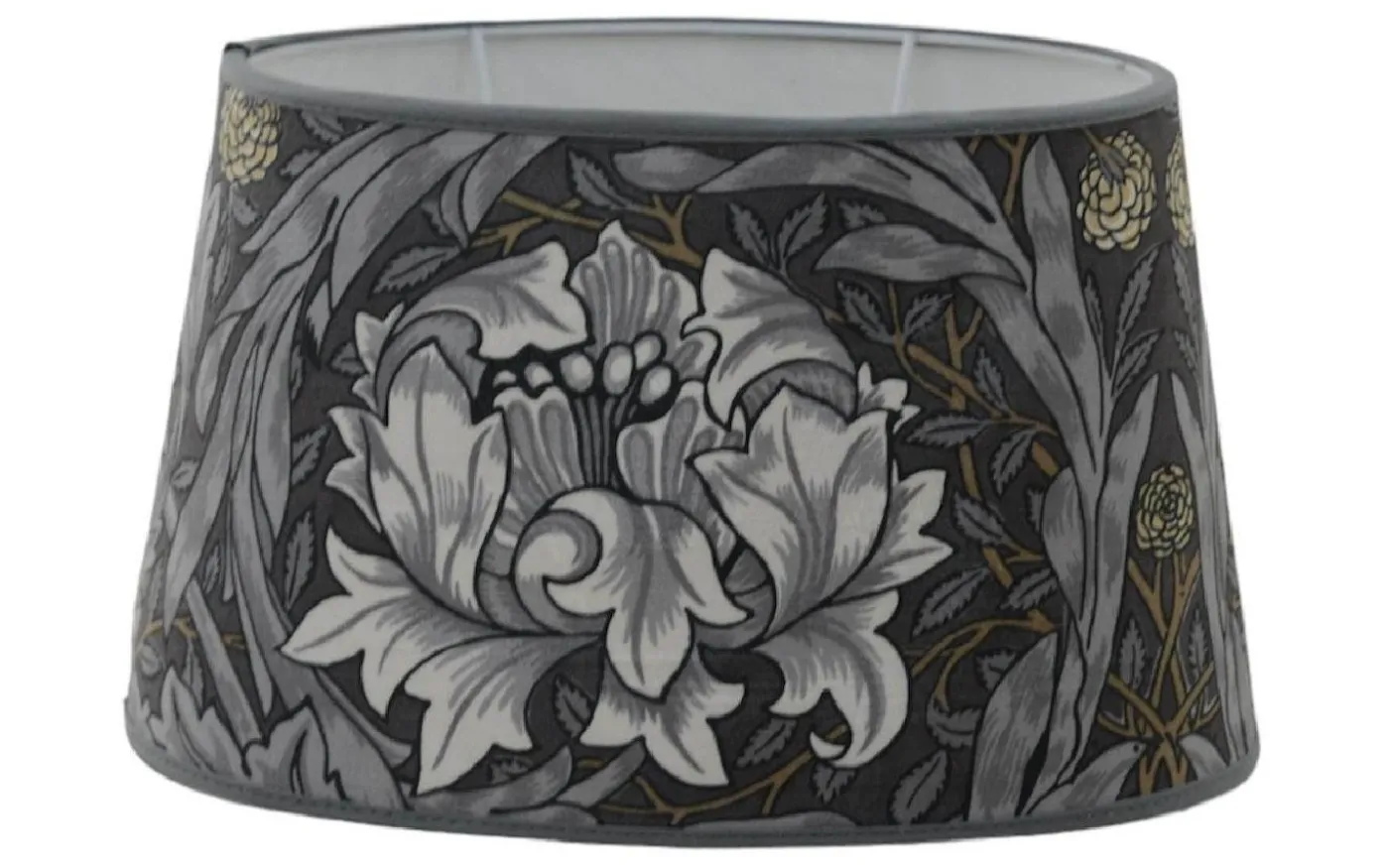 Elegant oval sammetslampskärm med William Morris dramatiska Africa Marigold-mönster i sofistikerade gråtoner. Den eleganta ovala formen framhäver det stora, expressiva blommotiven på lyxig sammet och skapar djup med monokrom elegans. Bredd 20 cm. En raffinerad designaccent som tillför både karaktär och tidlös brittisk stil till ditt hem.