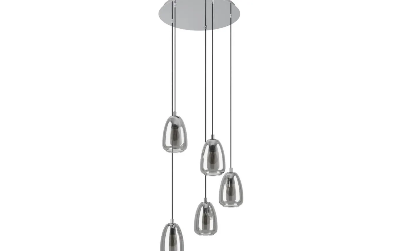 ALOBRASE taklampa har fem rundade lampskärmar i rökt svart glas. Lampskärmarna är upphängda i ett cirkulärt kromfärgat metalltak med svarta kablar. Hängen hänger i ett spiralarrangemang, som särskilt kompletterar moderna interiörer och ger stilfull belysning för alla utrymmen, oavsett om det är i vardagsrummet eller ovanför bordet i matsalen.